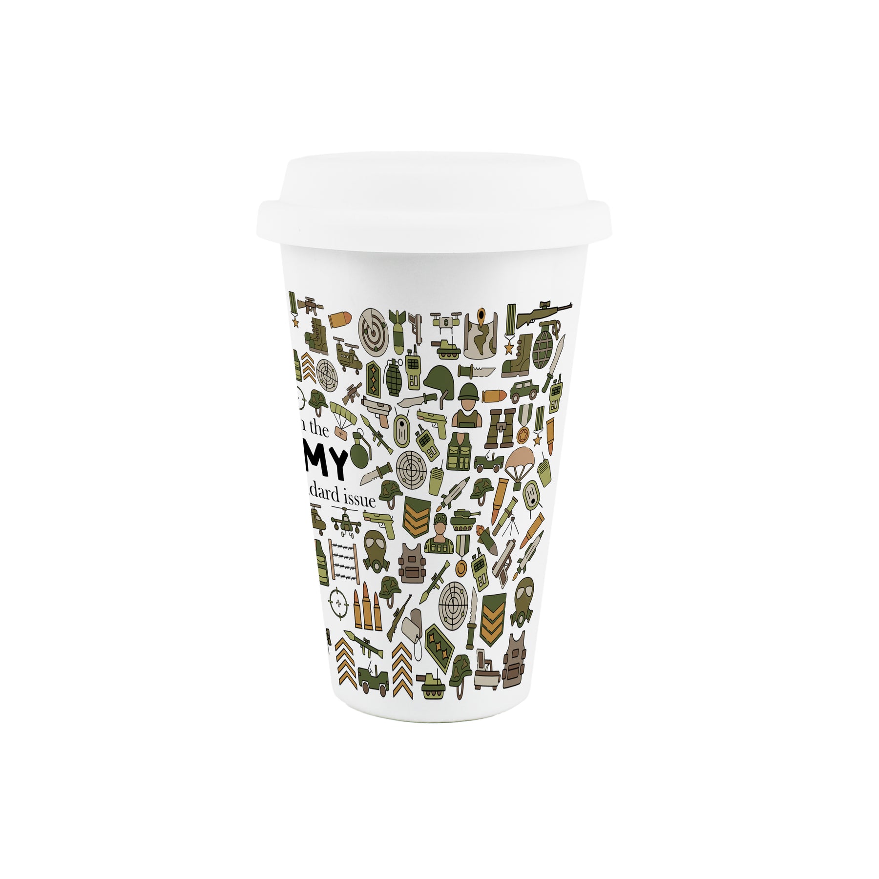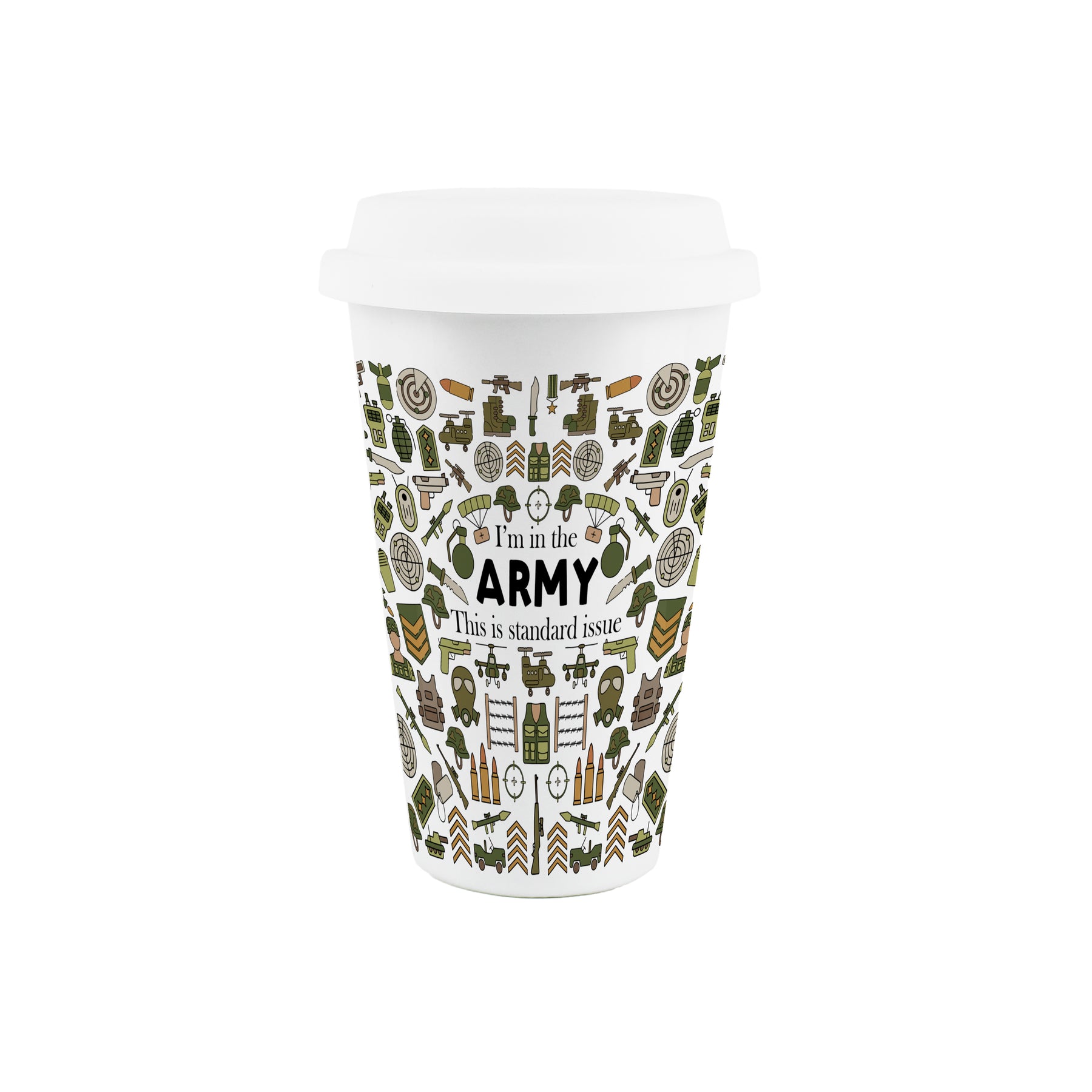 This military themed travel mug is the perfect gift for any soldier in your life. Featuring a print filled with all the tools and weaponry required to go to battle, partnered with comical text quoting "I'm in the army - This is standard issue" on the front, this will be sure to make them smile on off-duty days!