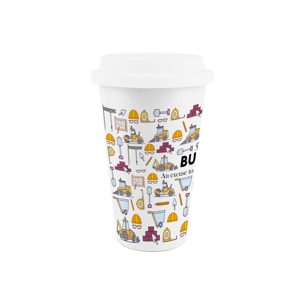 This fun ceramic travel mug is a perfect gift for any builder in your life. Featuring a print filled with illustrations relating to a day in construction around the mug, partnered with text quoting "Builder - An excuse to still play with diggers" on the front, this will be sure make them chuckle when stopping for a coffee break!