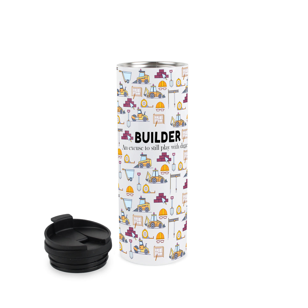 This fun stainless steel travel flask is a perfect gift for any builder in your life. Featuring a print filled with illustrations relating to a day in construction around the tumbler, partnered with text quoting "Builder - An excuse to still play with diggers" on the front, this will be sure make them chuckle when stopping for a coffee break!