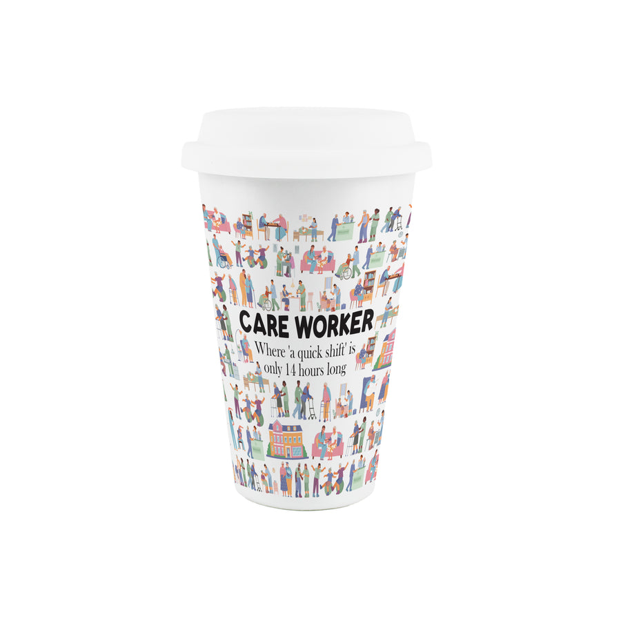 This humorous ceramic travel mug is a perfect gift any care worker you know! Featuring a range of illustrations relating to a day in the job all around the porcelain mug and the text "Care Worker - Where 'a quick shift' is only 14 hours long" on the front, this will be sure to become their go-to choice every time they are making a hot drink for the journey to work!