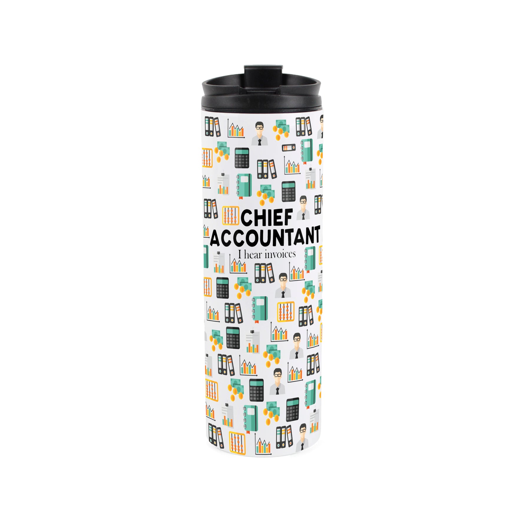 This maths-themed travel flask is a perfect gift for the chief accountant in your life! With an accountancy inspired print all around the travel mug and the text "Chief Accountant - I hear invoices" on the front, this will be sure to make those hot drinks taste even better on the way to work ahead of a long day in the office! An ideal gift for yourself or for friends in the trade.