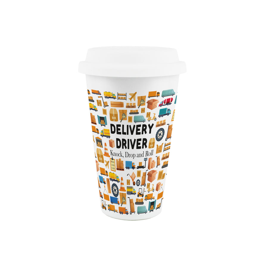 This illustrated ceramic travel mug is a perfect gift for any delivery driver in your life. Featuring a print filled with parcels, forklifts, checklists and more around the mug, partnered with comical text quoting "Delivery Driver - Knock, Drop and Roll" on the front, this will be sure to make them chuckle whilst loading their van and delivering goods to customers!