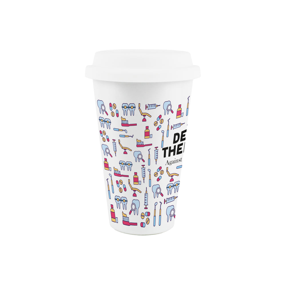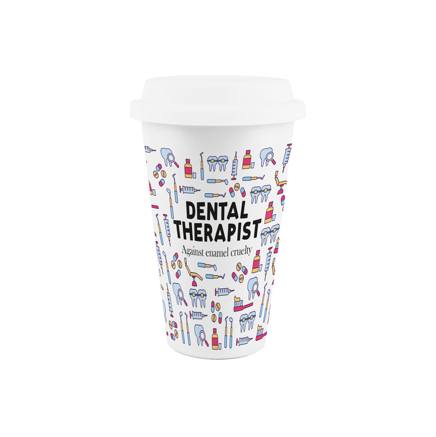 This dental-themed ceramic travel mug is a perfect gift for any dental therapist in your life. Featuring a print filled with dental equipment around the mug, partnered with comical text quoting "Dental Therapist - Against enamel cruelty" on the front, this will be sure to make them smile during a day at the practice!