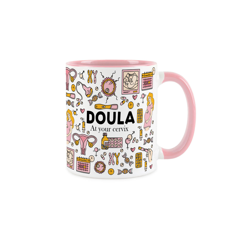 This fertility-themed pink ceramic mug is a perfect gift for the doula in your life! Featuring a pregnancy inspired print all around the mug and the text "Doula - At your cervix" on the front, this will be sure to make those hot drinks taste even better during those long days of supporting someone through their labour!