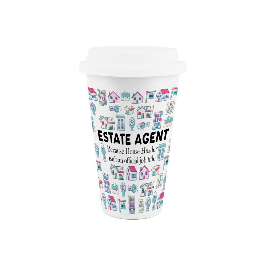 This property-themed ceramic travel mug is a perfect gift for any estate agent you know. Featuring a print relating to their day-to-day life on the job, partnered with text quoting "Estate Agent - Because House Hustler isn't an official job title" on the front. This is sure to be their tumbler of choice when they get the moment to enjoy a cuppa between viewings!