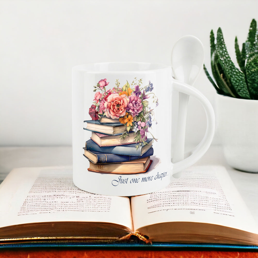 This lovely ceramic mug & spoon set features a book-themed design, with text reading 'Just one more chapter…'. A perfect gift for bookworms!