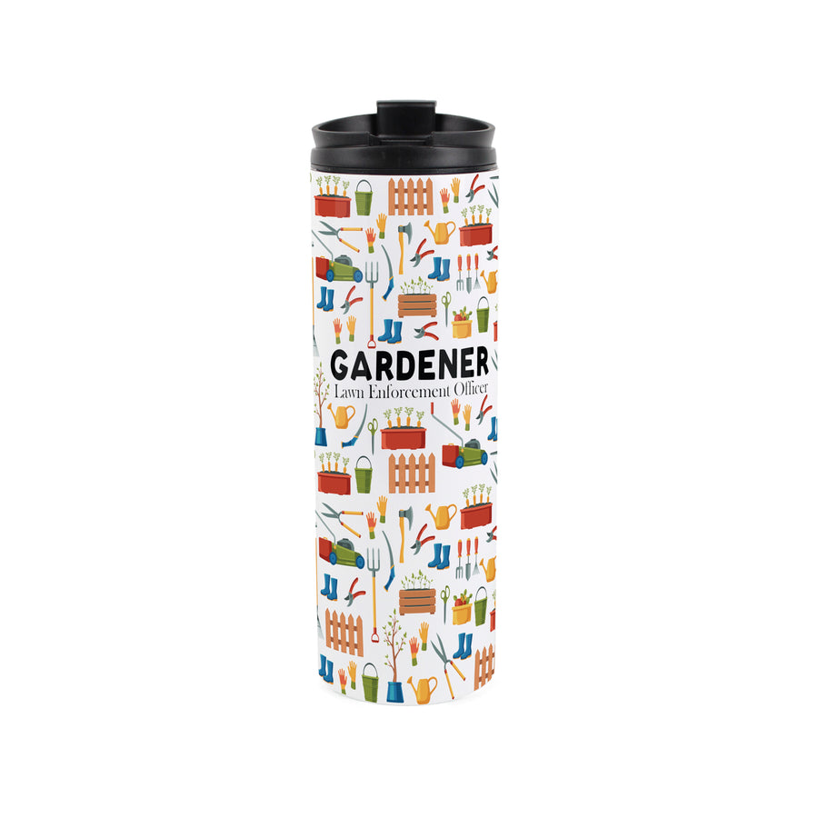 This comical stainless steel travel flask is a perfect gift for any gardener in your life. Featuring a range of garden themed illustrations, from forks and spades, to mowers and watering cans, partnered with text quoting "Gardener - Lawn Enforcement Officer" on the front, this tumbler is ideal for those who are professional gardeners or those who love gardening as a hobby!