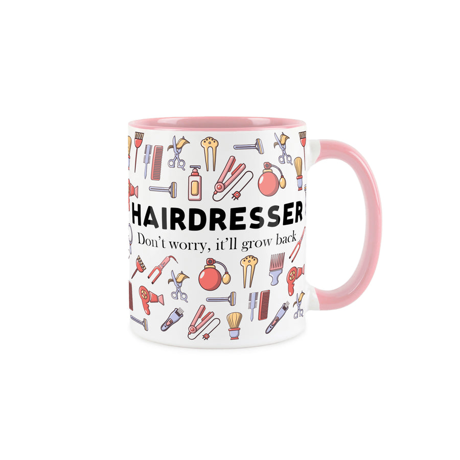 This stylist-themed mug is a perfect gift for the hairdresser in your life! Featuring a print filled with hair-styling related products all around the mug and the text "Hairdresser - Don't worry, it'll grow back" on the front, this will be sure to make those hot drinks taste even better during those long days in the salon, as well as giving them a chuckle while they work!