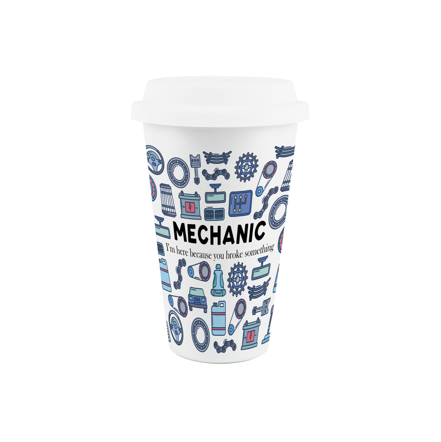 This porcelain travel mug is the ultimate companion for your days on the job. Just the thing for keeping you hydrated when fixing cars and vans! Perfect as a gift for yourself or for friends in the trade - with a funny quote reading 'Mechanic - I'm here because you broke something'.