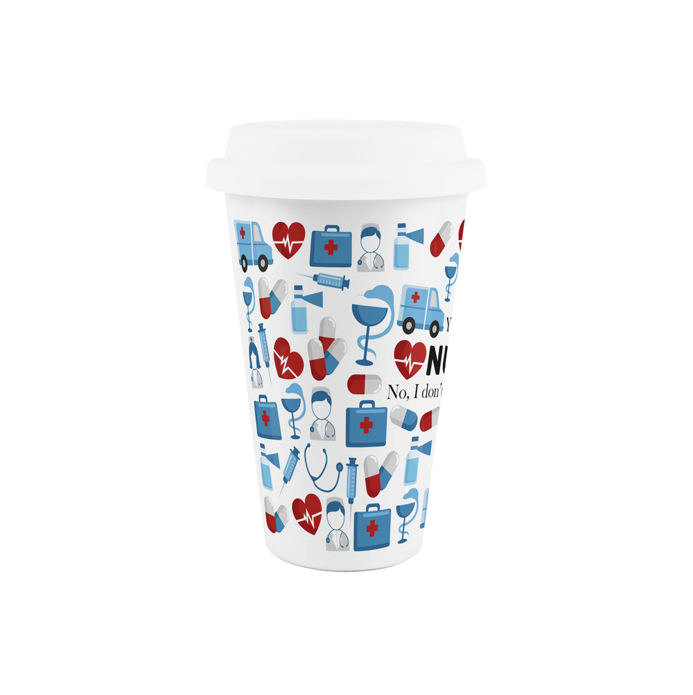 This porcelain travel mug is the ultimate companion for your days on the job. Perfect as a gift for yourself or for friends in the trade - with a funny quote reading 'Yes, I'm a nurse - No, I don't want to look at it', this mug is just the thing for keeping you hydrated when at the doctor's surgery or hospital!