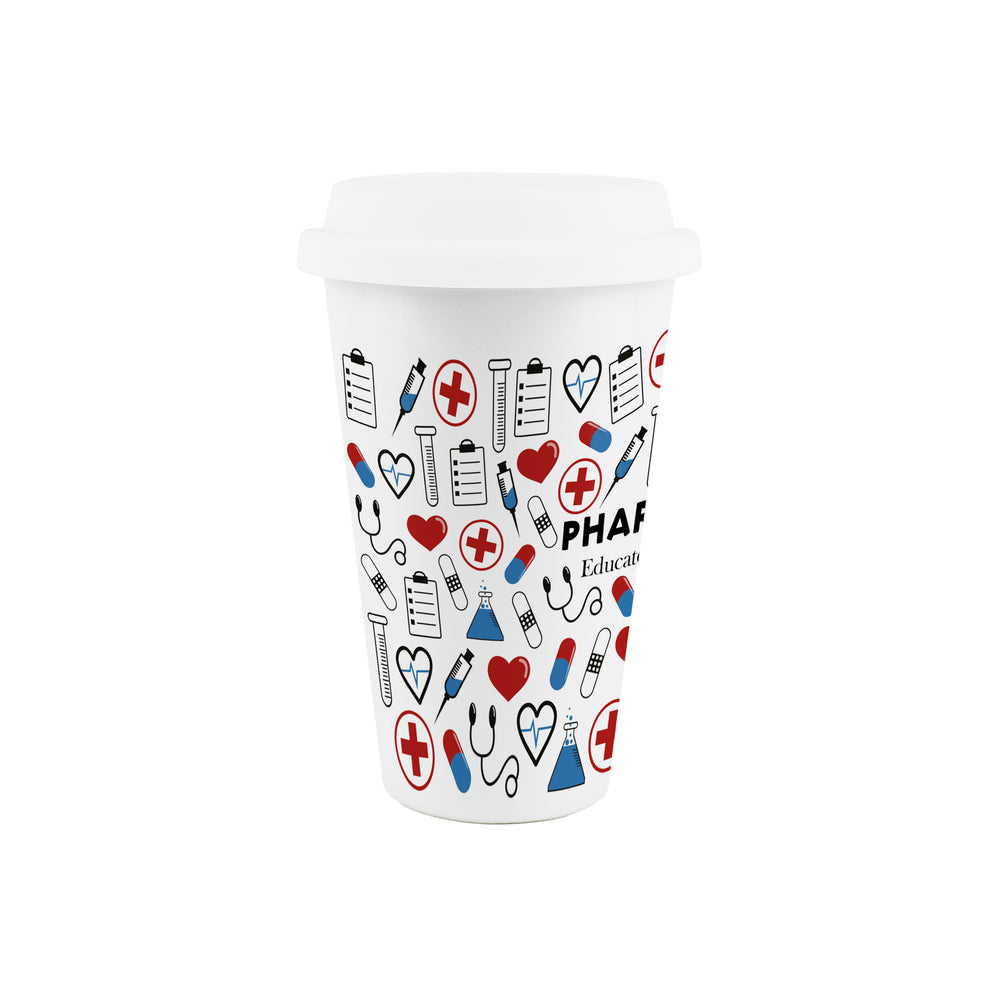This pharmacy-themed ceramic travel mug is a perfect gift for any pharmacist in your life! Featuring a print filled with medical related equipment around the mug and the humorous phrase "Pharmacist - Educated drug dealer" on the front, this will be sure to make their hot drinks taste even better!