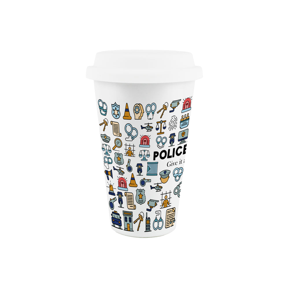 This comical ceramic travel mug is a perfect gift for any Policeman/Policewoman in your life. Featuring a range of illustrations relating to a day in the life of a copper, with text quoting 'Police Officer - Give it arrest will you?' on the front, this will be sure to give them a chuckle during days on the job.