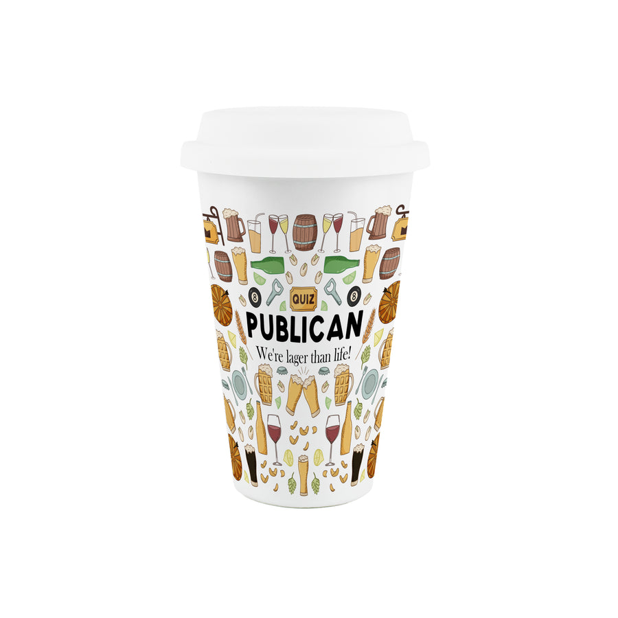 This bar themed ceramic travel mug is a perfect gift for any publican in your life. Featuring a print filled with drinks, bar snacks, dart boards and more around the mug, partnered with comical text quoting "Publican - We're lager than life!" on the front, this will be sure to make them smile between pouring pints and clearing tables!