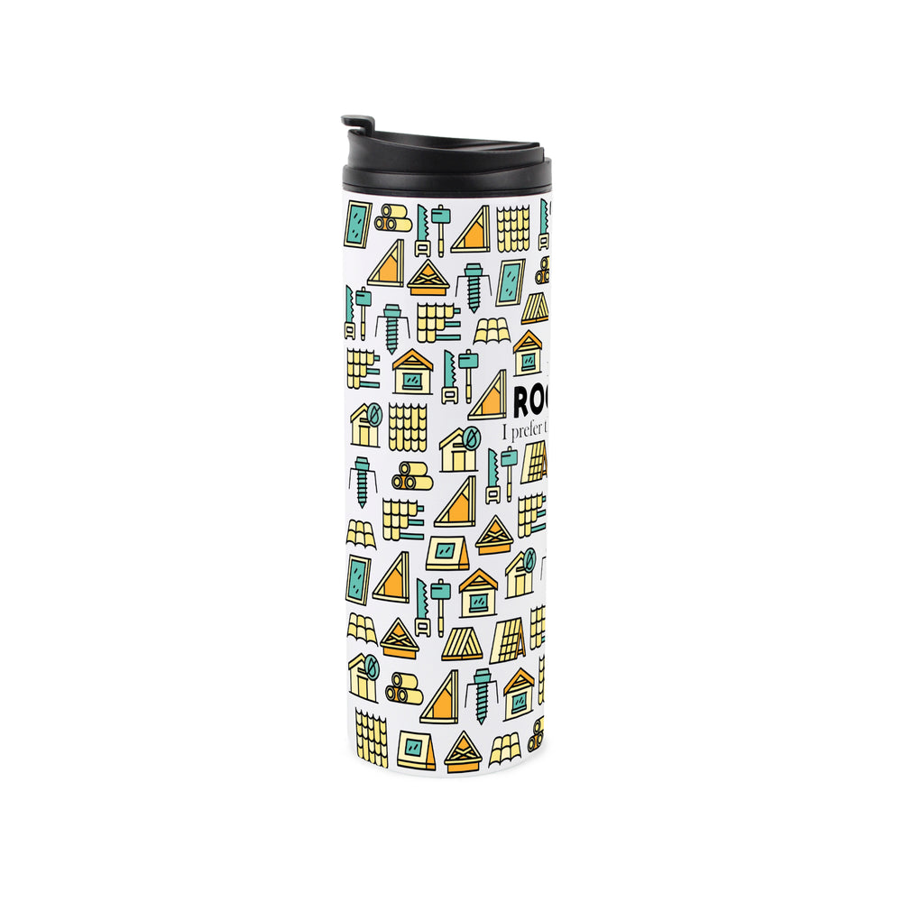 This building-themed travel flask is a perfect gift for the roofer in your life! Featuring a tool/tile inspired print all around the travel mug and the text "I'm a roofer, I prefer the shingle life" on the front, this will be sure to make their drinks taste even better during those long days in the sun tiling roofs!