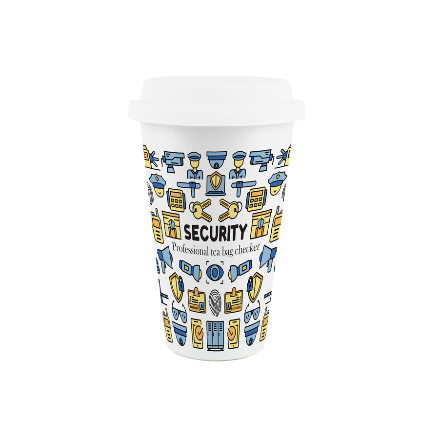 This illustrated ceramic travel mug is a great gift for anyone you know that works in security. Featuring a design filled with finger prints, ID passes, CCTV, safety and protection equipment and more around the mug, partnered with comical text quoting "Security - Professional tea bag checker", this will be their favourite mug for enjoying a hot drink either on or off shift!