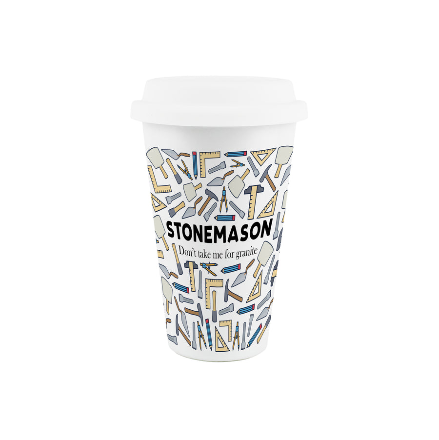 This comical, ceramic travel mug is a perfect gift for any stonemason in your life. Featuring a range of tool & measurement themed illustrations, with text quoting 'Stonemason - Don't take me for granite' on the front, this will be sure to give them a chuckle during long days of cutting & preparing materials!
