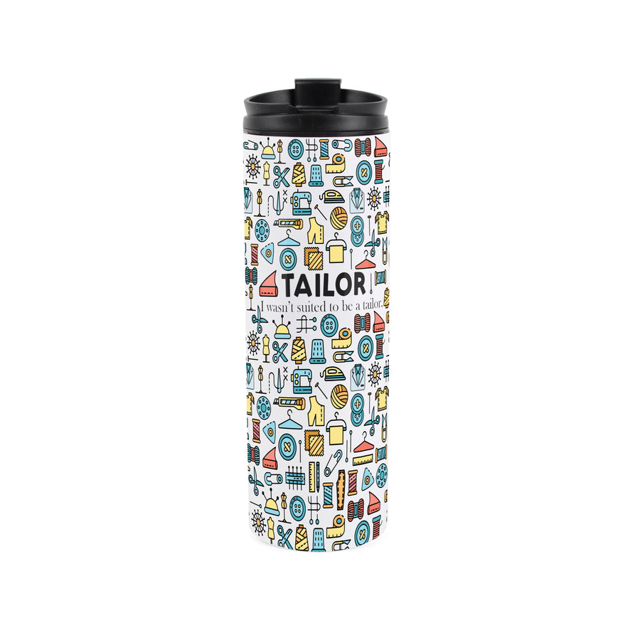 This illustrated stainless steel travel flask is a perfect gift for any tailor in your life! Featuring a print filled with mannequins, sewing machines and tailoring tools, along with the text "Tailor - I wasn't suited to be a tailor" on the front, this will be sure to make those hot drinks taste even better during an afternoon of alterations!