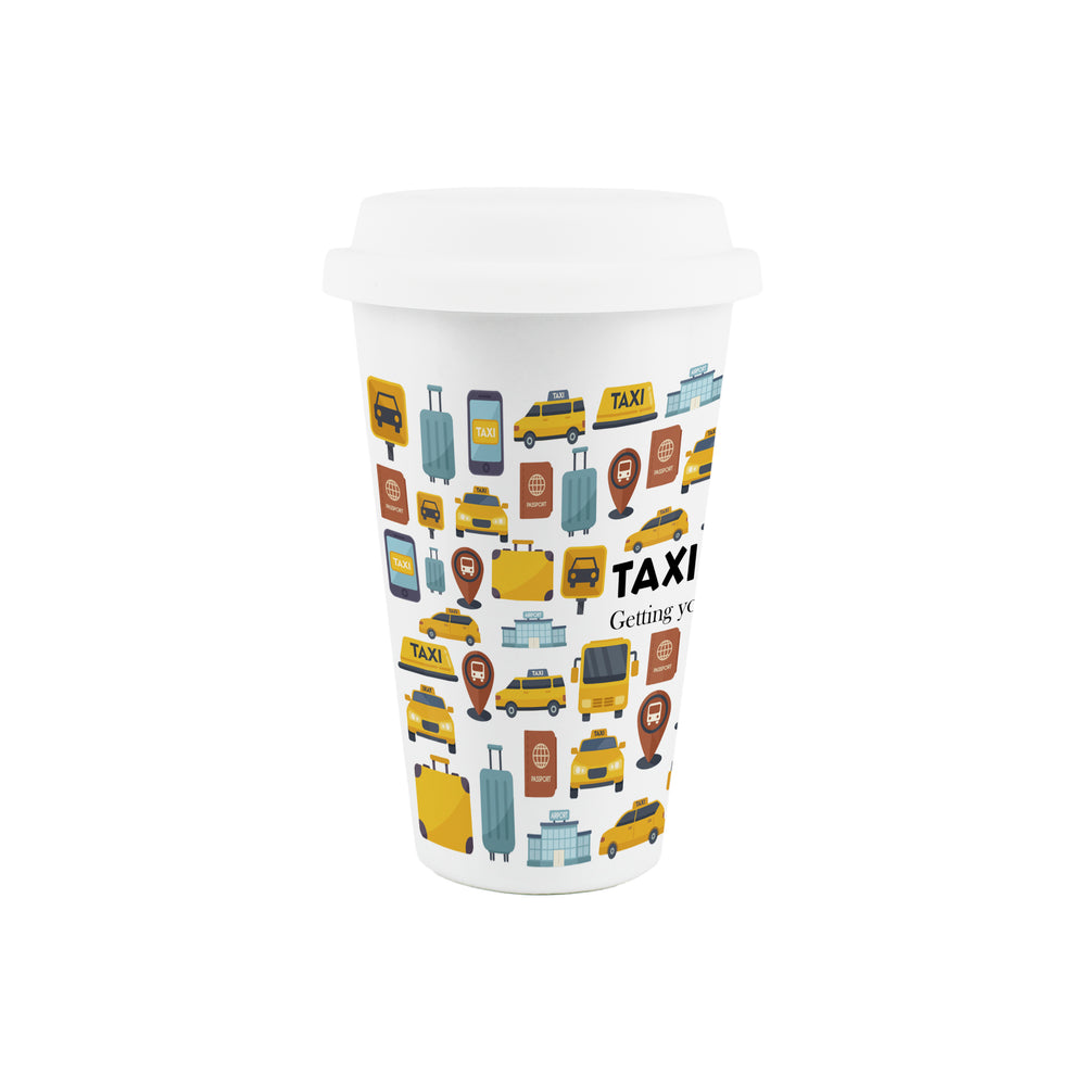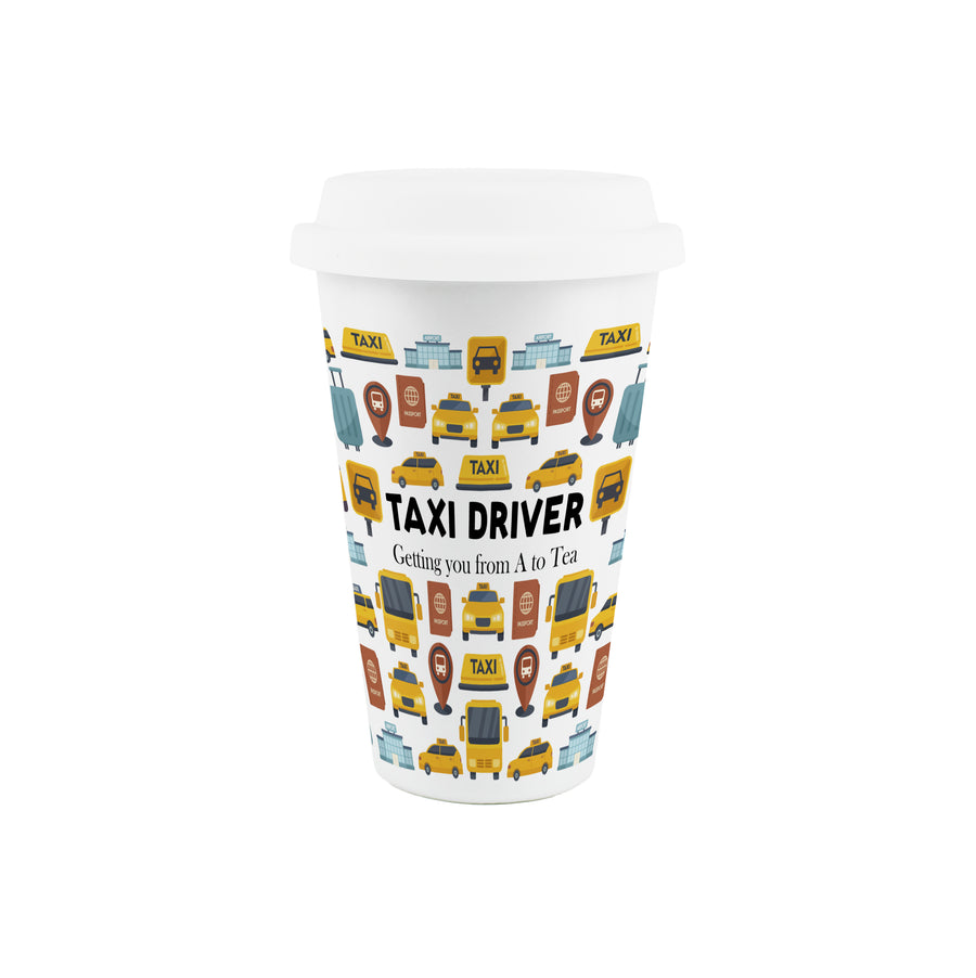 This driving-themed porcelain travel mug is a perfect gift for the taxi driver in your life! Featuring a yellow cab inspired print all around the ceramic cup and the text "Taxi Driver- Getting you from A to Tea" on the front, this will be sure to make their drinks taste even better during those long days driving customers around!