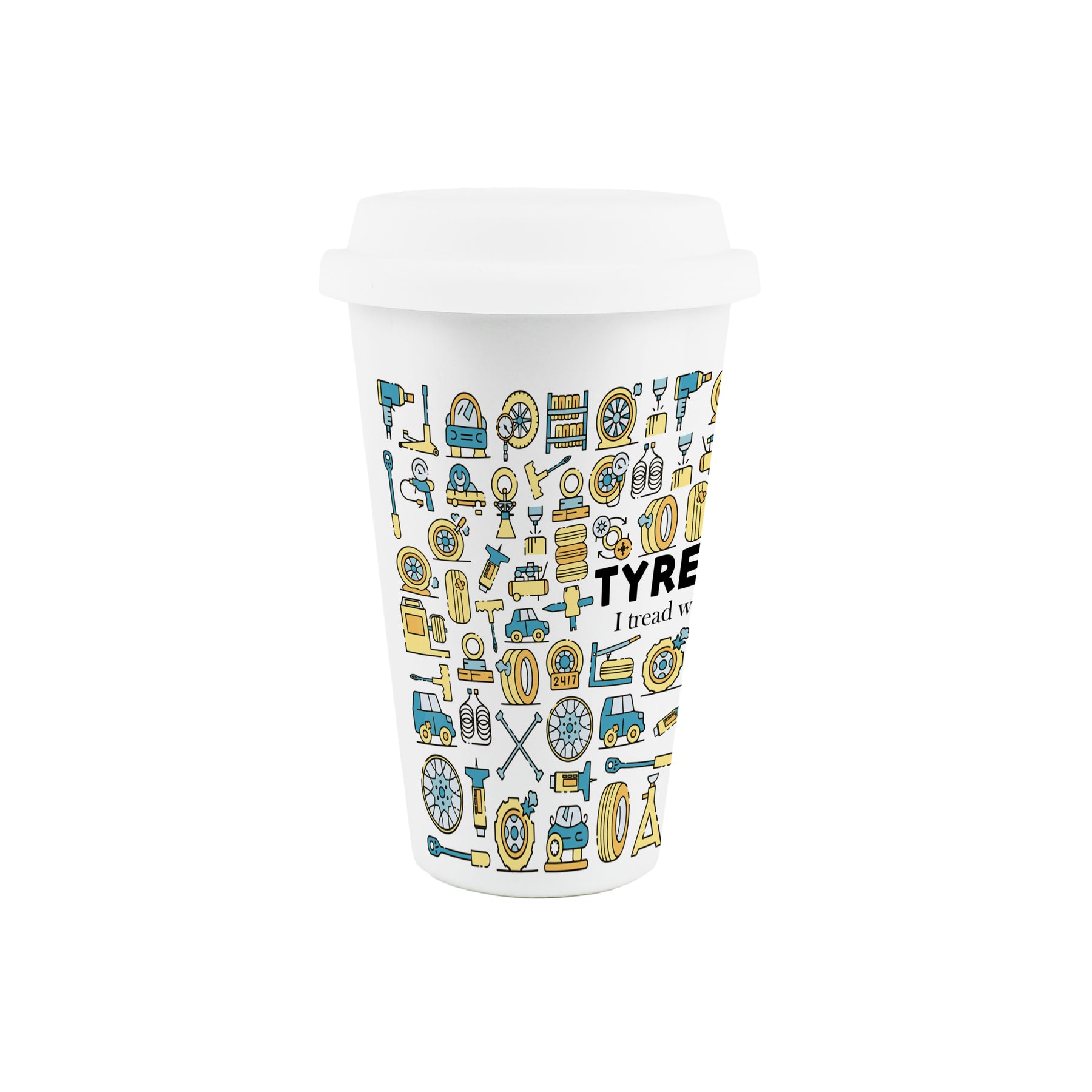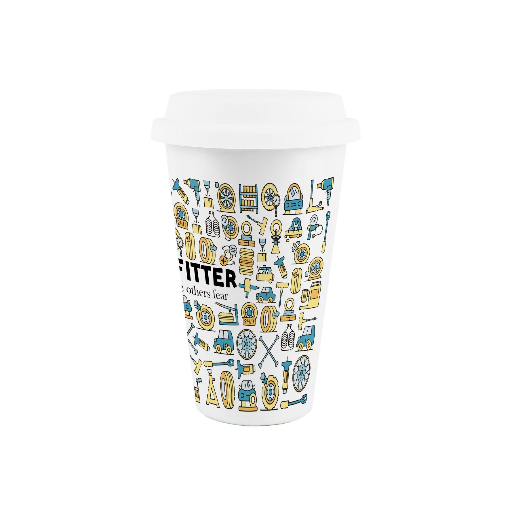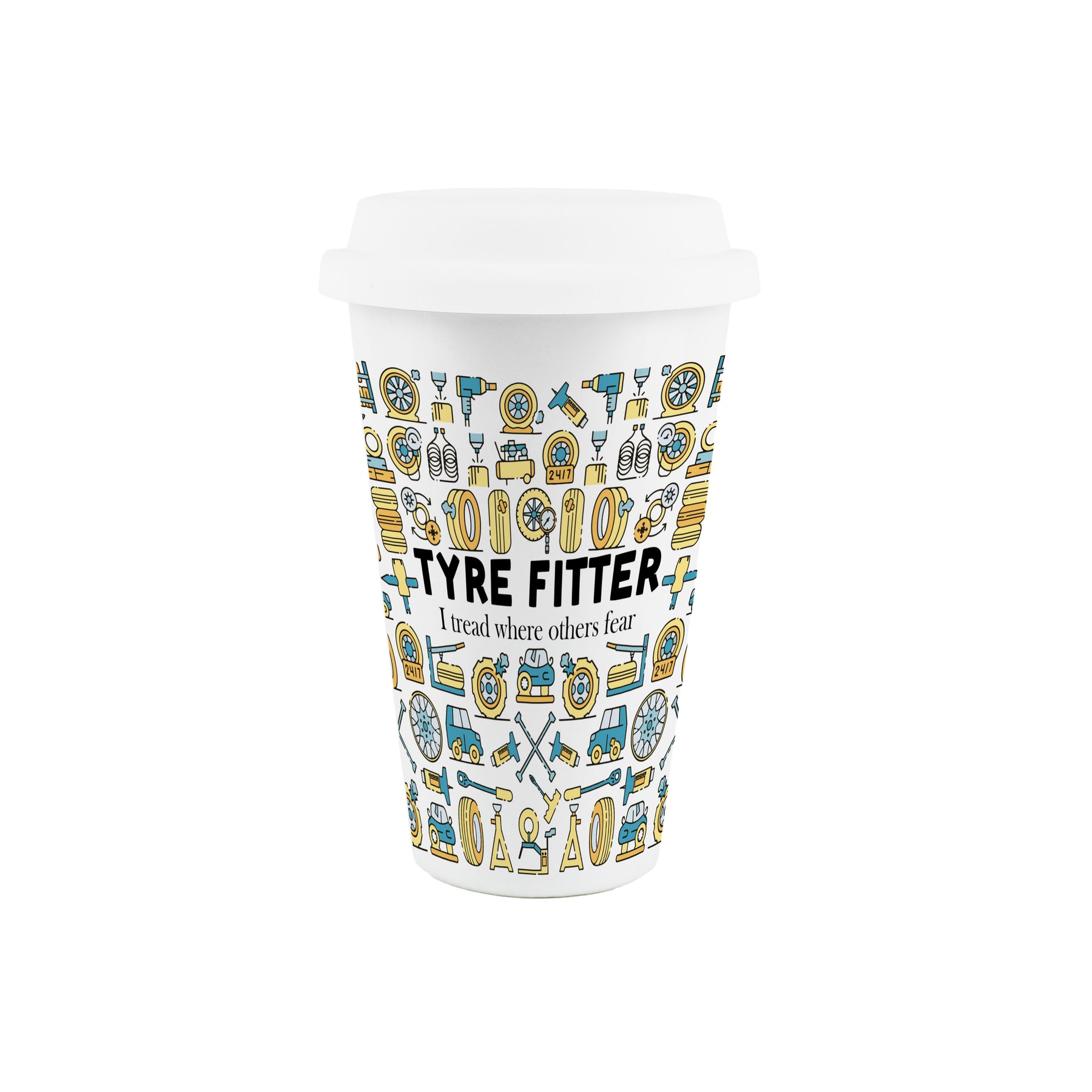 This ceramic travel mug is a perfect gift for the tyre fitter in your life! With a car inspired print all around the cup and the text "Tyre Fitter - I tread where others fear" on the front, this will be sure to make those hot drinks taste even better on those long days in the garage!