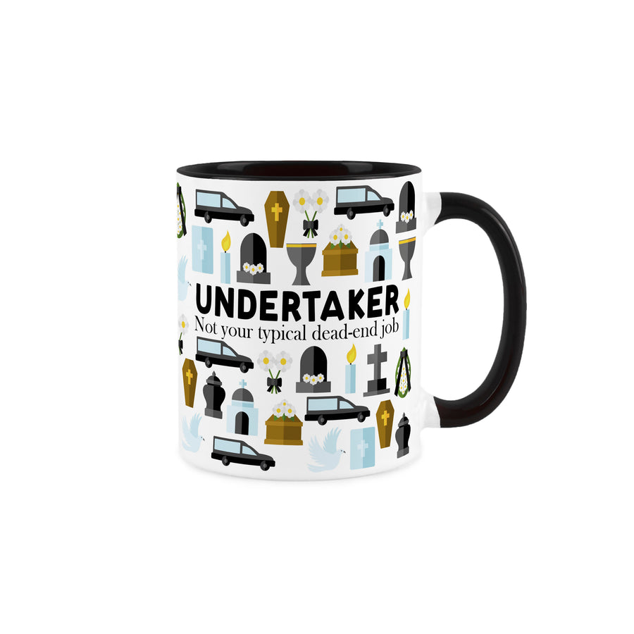 This undertaker-themed mug is a unique gift for the funeral director in your life! Featuring a print filled with all things funeral related around the mug and the text "Undertaker - Not your typical dead-end job" on the front, this mug is ideal for those with a dark sense of humour.