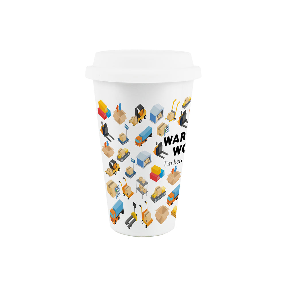This fun ceramic travel mug features a warehouse themed print, with the amusing quote - 'Warehouse Worker - I'm here to fork stuff up'. Perfect as a gift for yourself or for friends in the trade!
