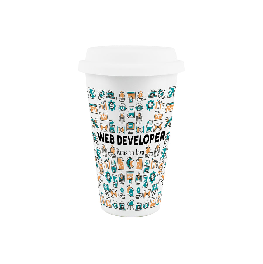 This comical ceramic travel mug is a perfect gift for any web developer in your life. Featuring a range of software and technical computing themed illustrations, with text quoting "Web Developer - Runs on Java" on the front, this will be sure to give them a chuckle during days in the office!