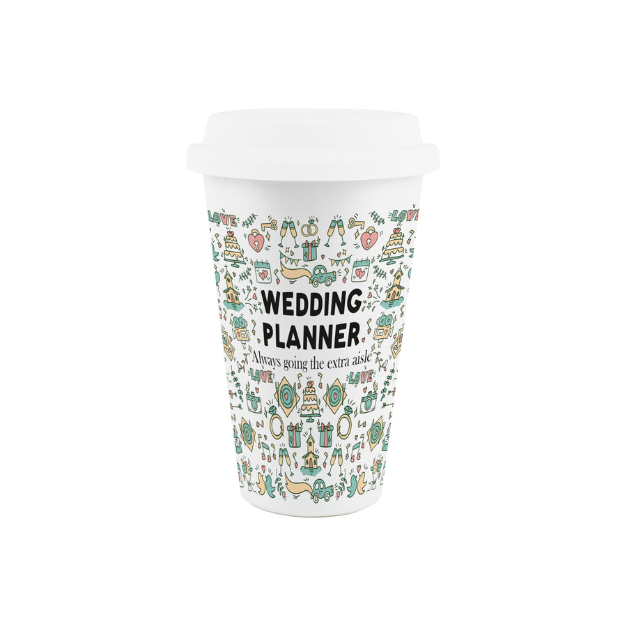 This travel mug is a perfect gift for the wedding planner in your life! Featuring a fun wedding inspired print all around the porcelain mug and the text "Wedding Planner - Always going the extra aisle" on the front, this will be sure to become their go-to choice when they need a coffee to get through a stressful day of organising.