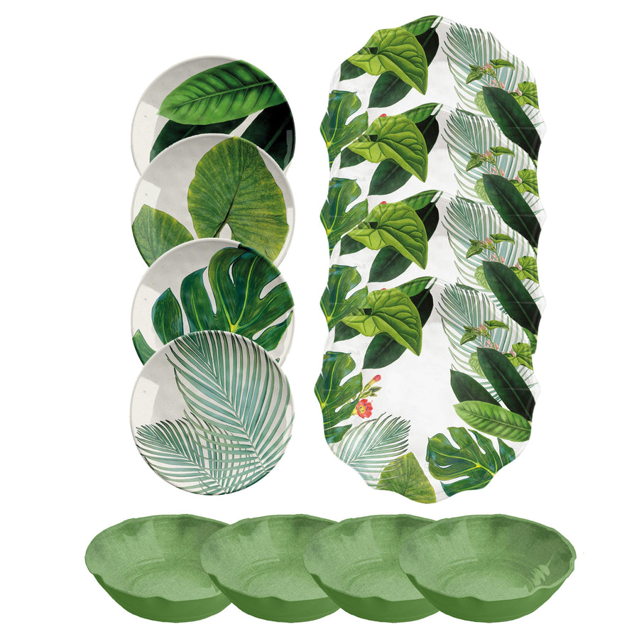 Wow your dinner guests with this beautiful leaf design Amazon Floral melamine dinnerware set. Containing dinner plates, side plates and bowls, this set is the perfect addition to add some colour to your crockery collection - particularly for outside entertaining on those warm, sunny days. What’s more, it looks and feels just like ceramic with its glossy glazed finish, so your guests will find it hard to tell that it isn’t ceramic!