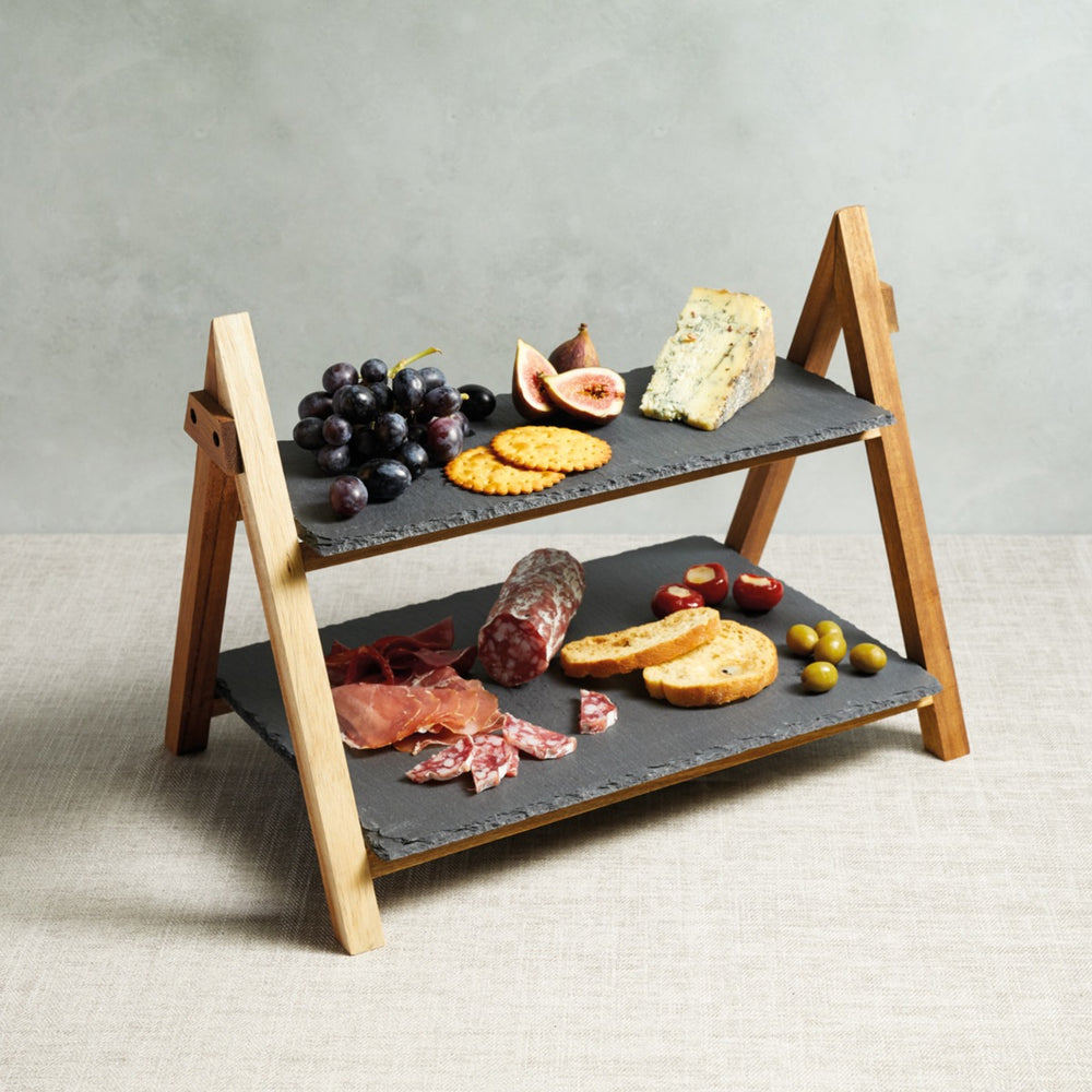 Give your dinner party, wedding or event that extra edge with this slate and acacia wood serving stand. Perfect as a centrepiece or part of your food tables, this 2-tier platter is ideal for serving cheeses, snacks, tapas and desserts, and so much more!
