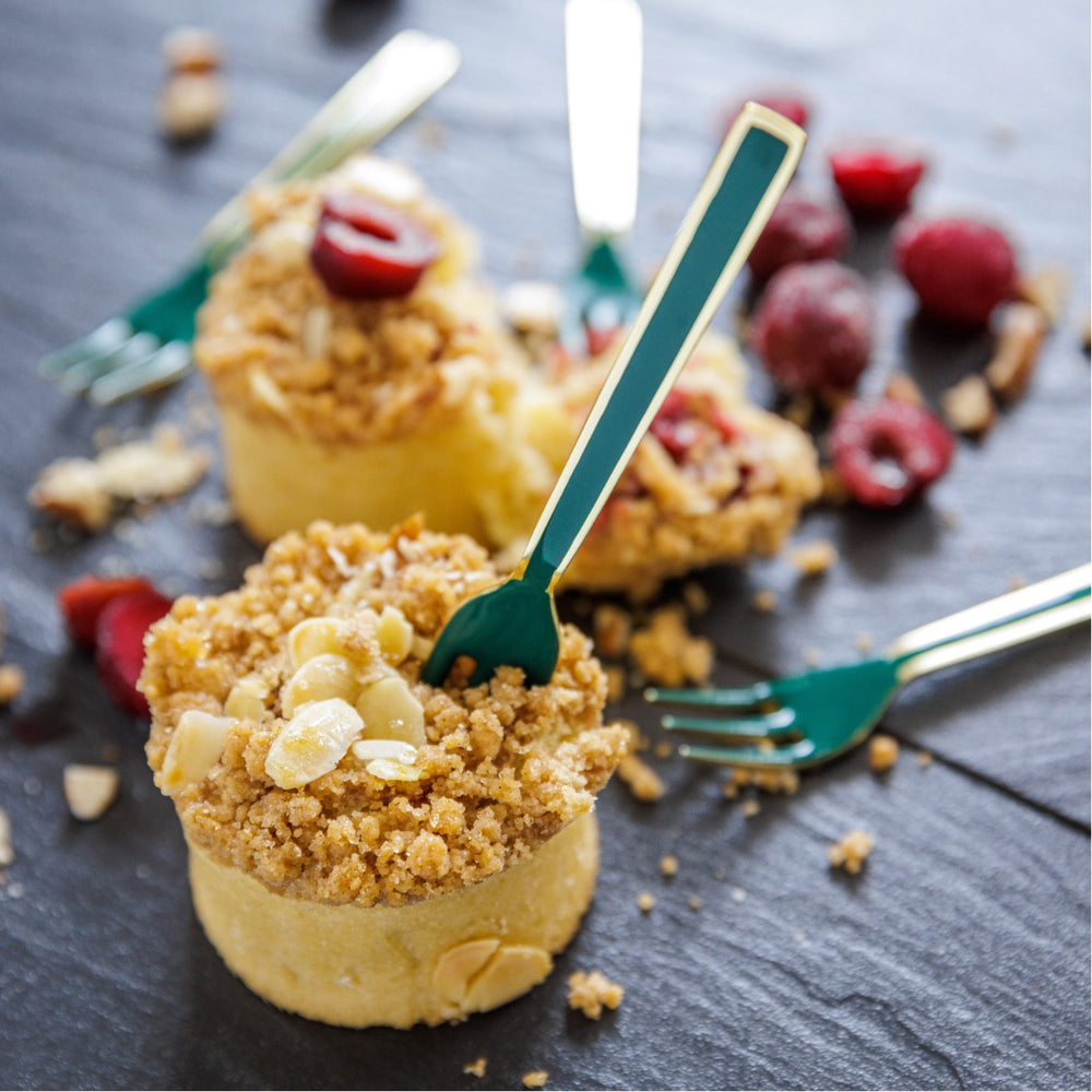 Bring opulence and luxury to your table with this set of four mini serving forks from the Artesà serveware collection! Crafted from gold-plated stainless steel with an emerald-green enamel finish, these forks are lightweight and comfortable to use.