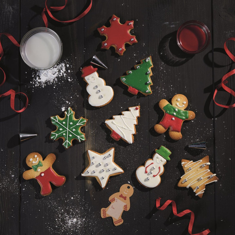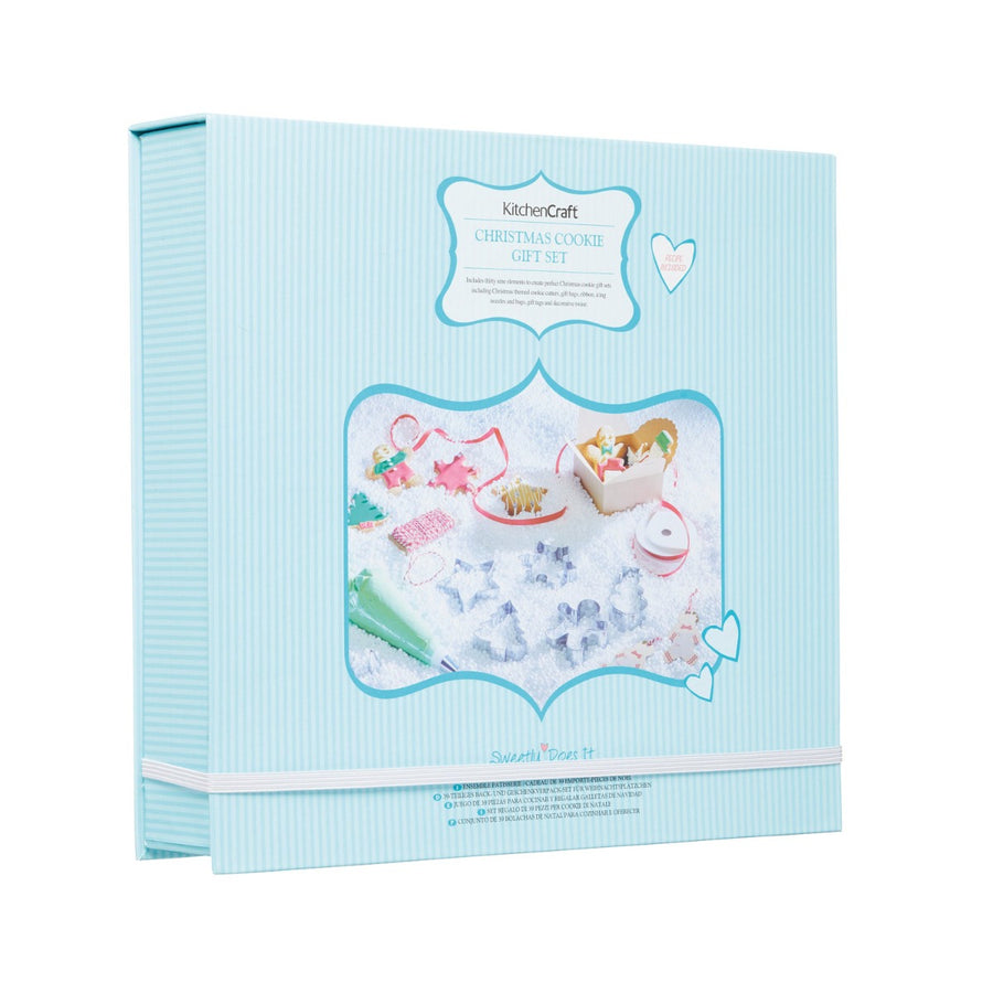 This set includes 5 Christmas themed cookie cutters, 6 fold up gift boxes, 6 clear gift bags, 4 icing bags, 2M of ribbon, 1 nozzle coupler, 3 decorative nozzles, 12 gingerbread man gift tags and 1 roll of red and white twine.