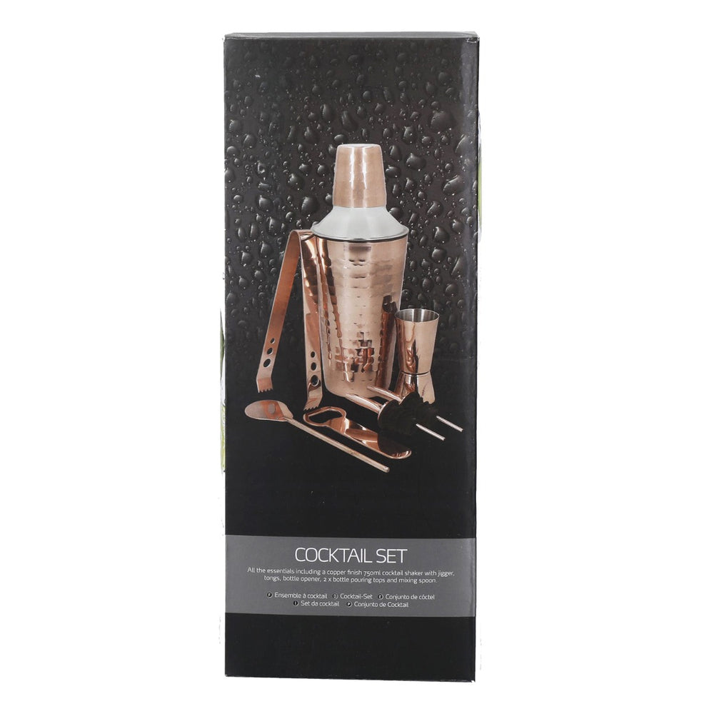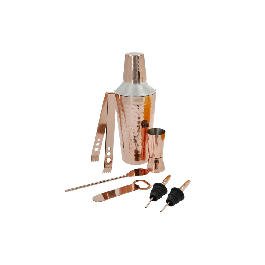 The set includes a cobble style shaker complete with strainer and cap, double-sided jigger, bottle opener, mixing spoon, a pair of bar tongs & two bottle pourers with silicone seals. All the pieces from this set are made from high quality, rust resistant stainless steel with a dazzling copper finish.