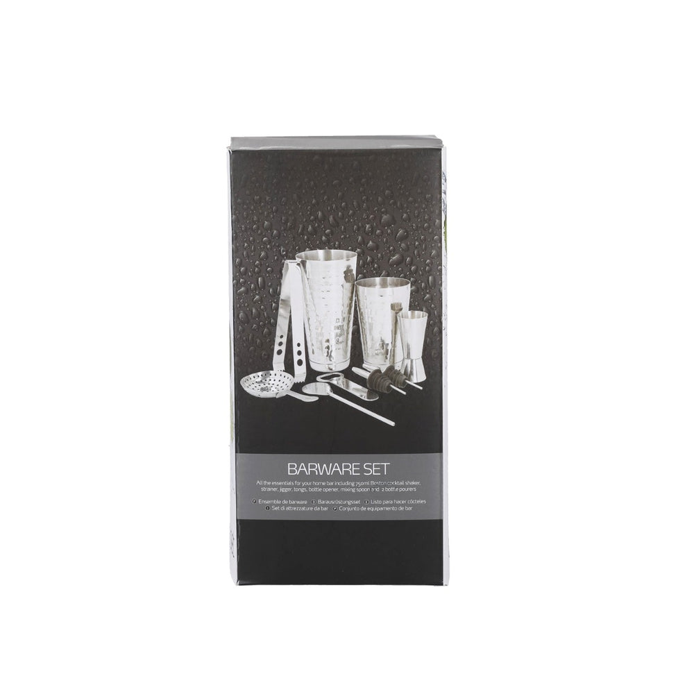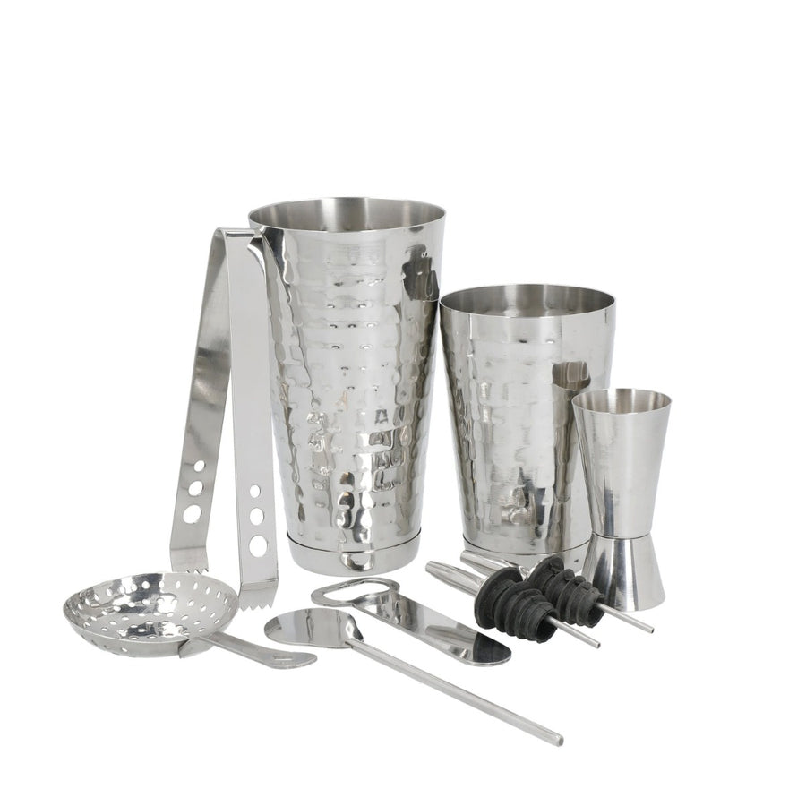 The set includes a two-piece cocktail shaker, double-sided jigger, bottle opener, mixing spoon, a pair of bar tongs, strainer & two bottle pourers with silicone seals. All the pieces from this set are made from high quality, rust resistant stainless steel and the shaker features a hammered finish for an extra touch of finesse.