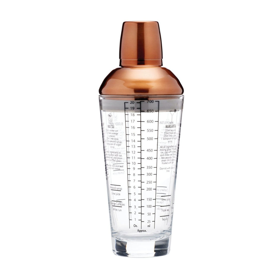 A perfect gift for anyone that likes a cheeky cocktail! This gorgeous cocktail shaker is perfect for making your favourite classics, or for trying something new by following one of the six recipes printed onto the shaker. It has a tapered glass body to make it easy to 'get your shake on' when you are working your magic, as well as an internal strainer for a smooth end result. The shaker is completed with a copper stainless steel lid for a luxurious look when on show in your home.