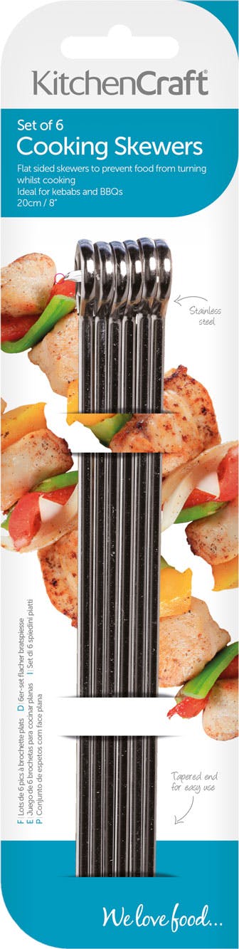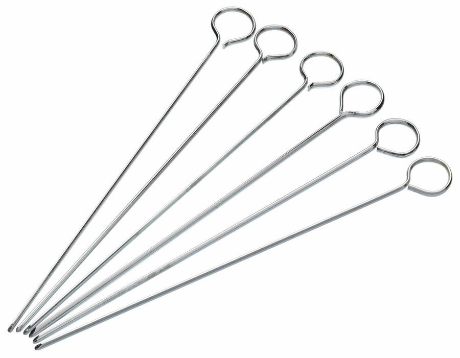 This pack of six reusable metal cooking skewers is ideal for cooking a variety of different types of kebabs and party foods. Featuring a flat side to prevent food from turning whilst cooking and a lifting ring at the end for easy handling.