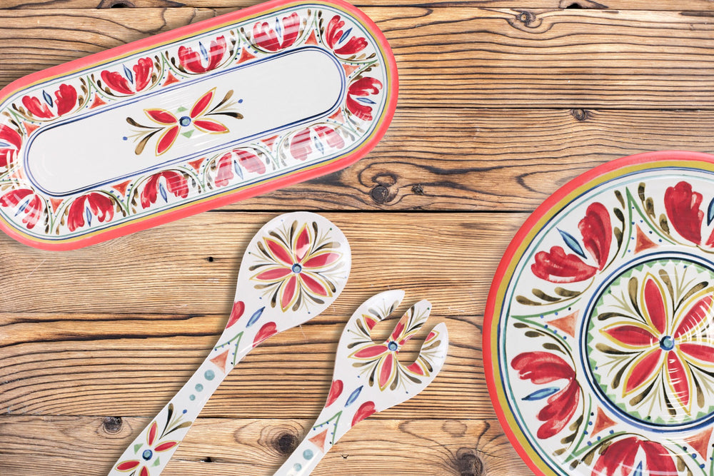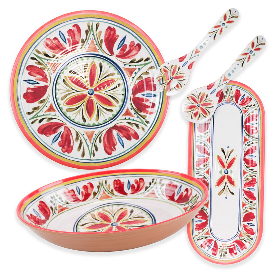 Bring a touch of those Mediterranean vibes with you wherever you go with this rustic styled outdoor dining set. Containing an oval serving bowl, oval tray, round platter and salad servers, all featuring patterns bold enough to give you warmth and comfort, yet nostalgic memories of days gone by this set is great for serving a variety of tasty summer dishes at large family gatherings.