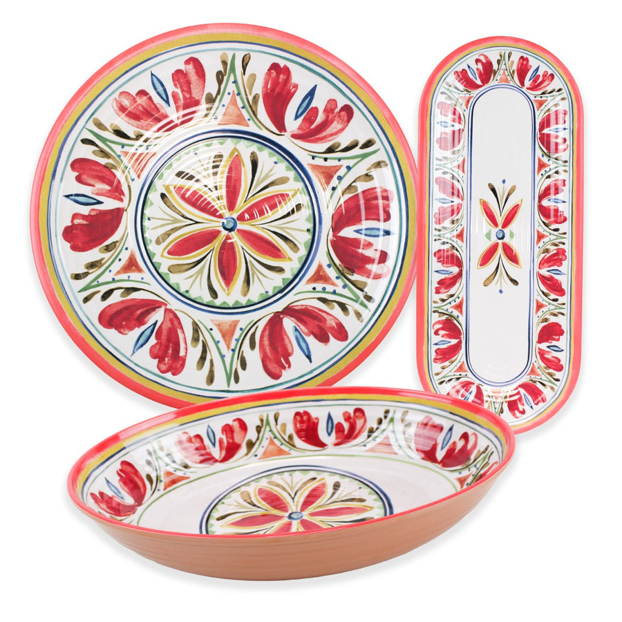Bring a touch of those Mediterranean vibes with you wherever you go with this rustic styled outdoor dining set. Containing an oval serving bowl, oval tray and a round platter, all featuring patterns bold enough to give you warmth and comfort, yet nostalgic memories of days gone by, this set is ideal for any outdoor dining needs!