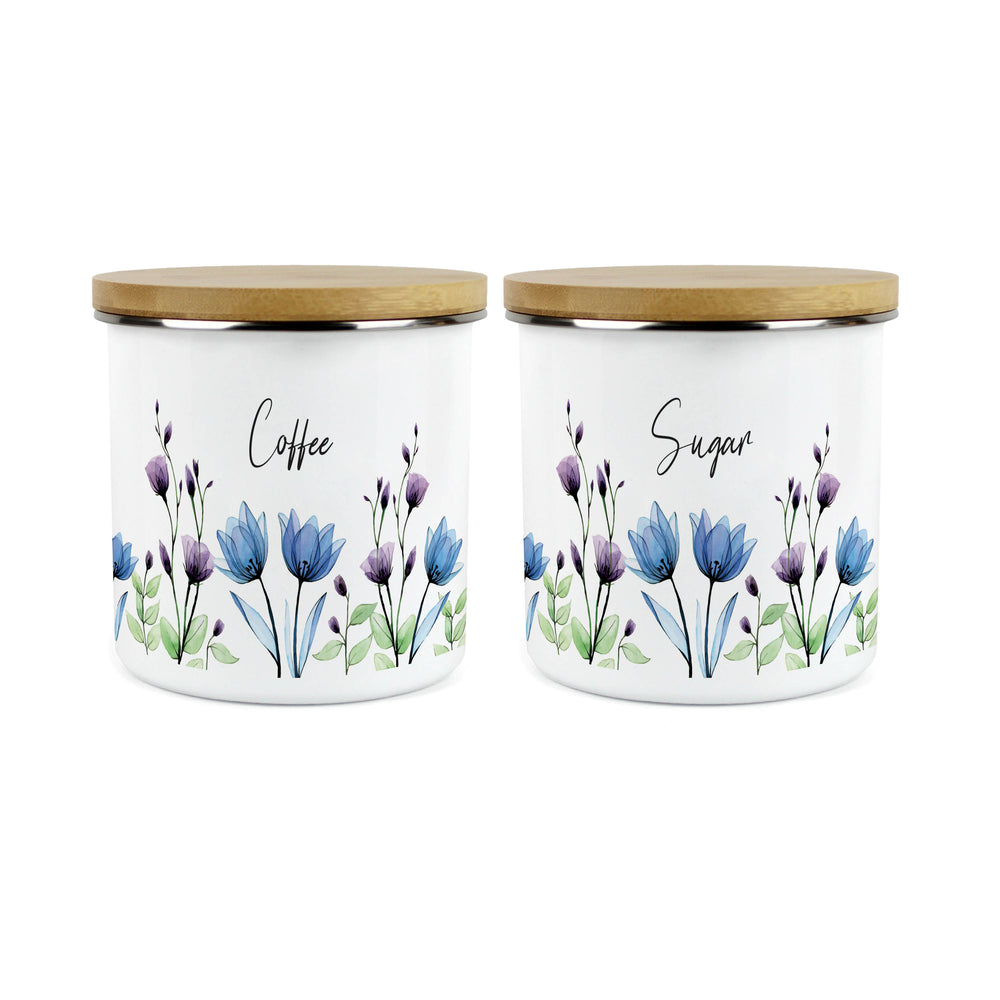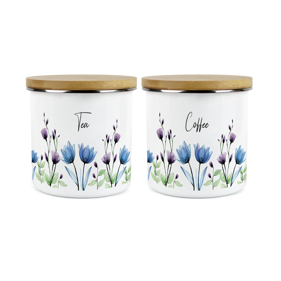 Displaying a pretty blue and purple flowers design, this duo set of sturdy enamel storage containers are sure to brighten any kitchen counter! Available in two sizes, these sets are ideal for storing your hot drinks essentials.