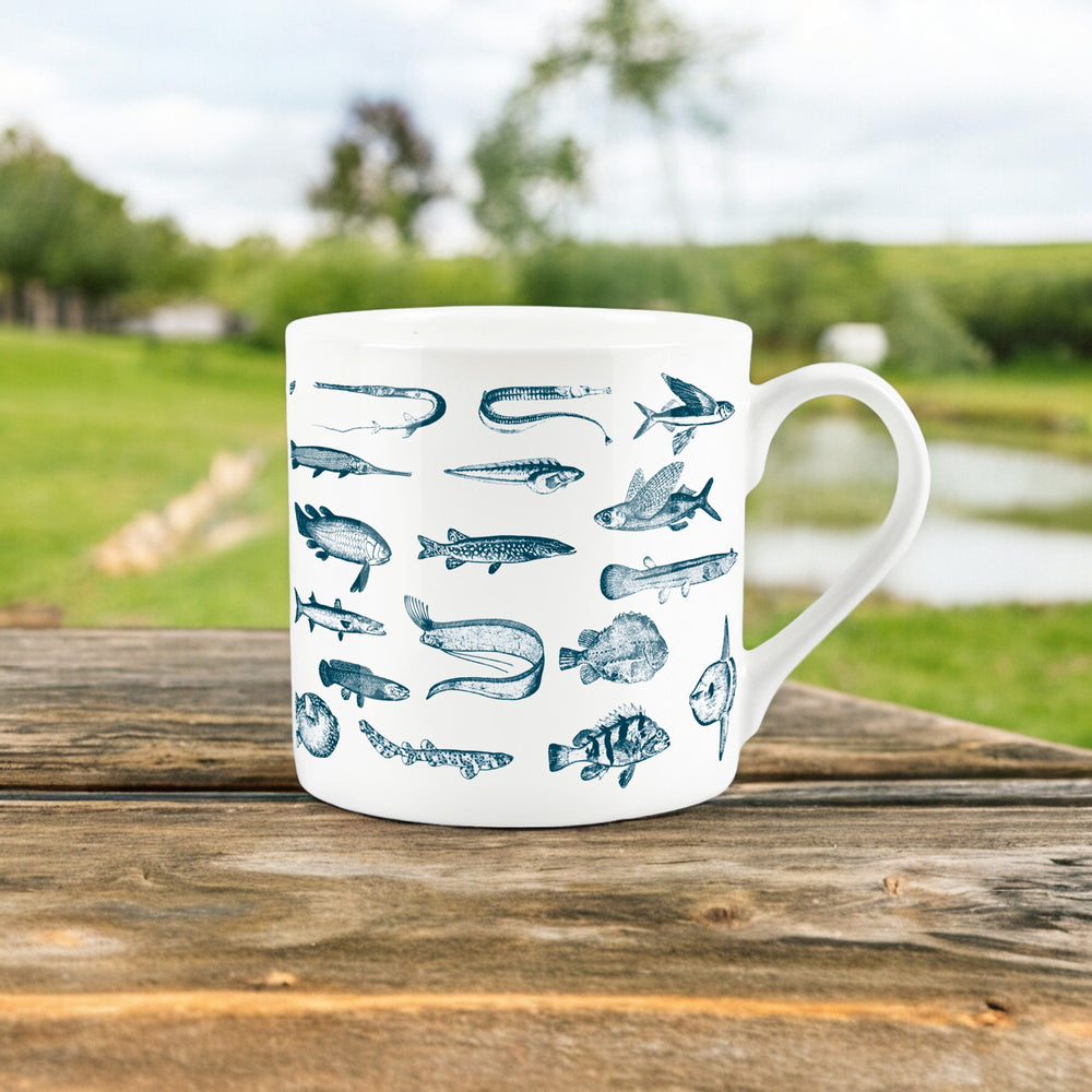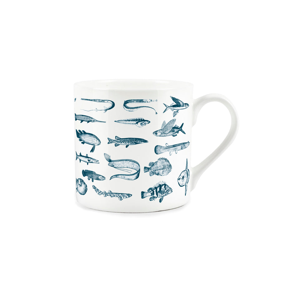 Enjoy a cuppa in a mug themed around fishing and the ocean! Perfect as a gift for yourself or for others, with a vintage blue fish print.