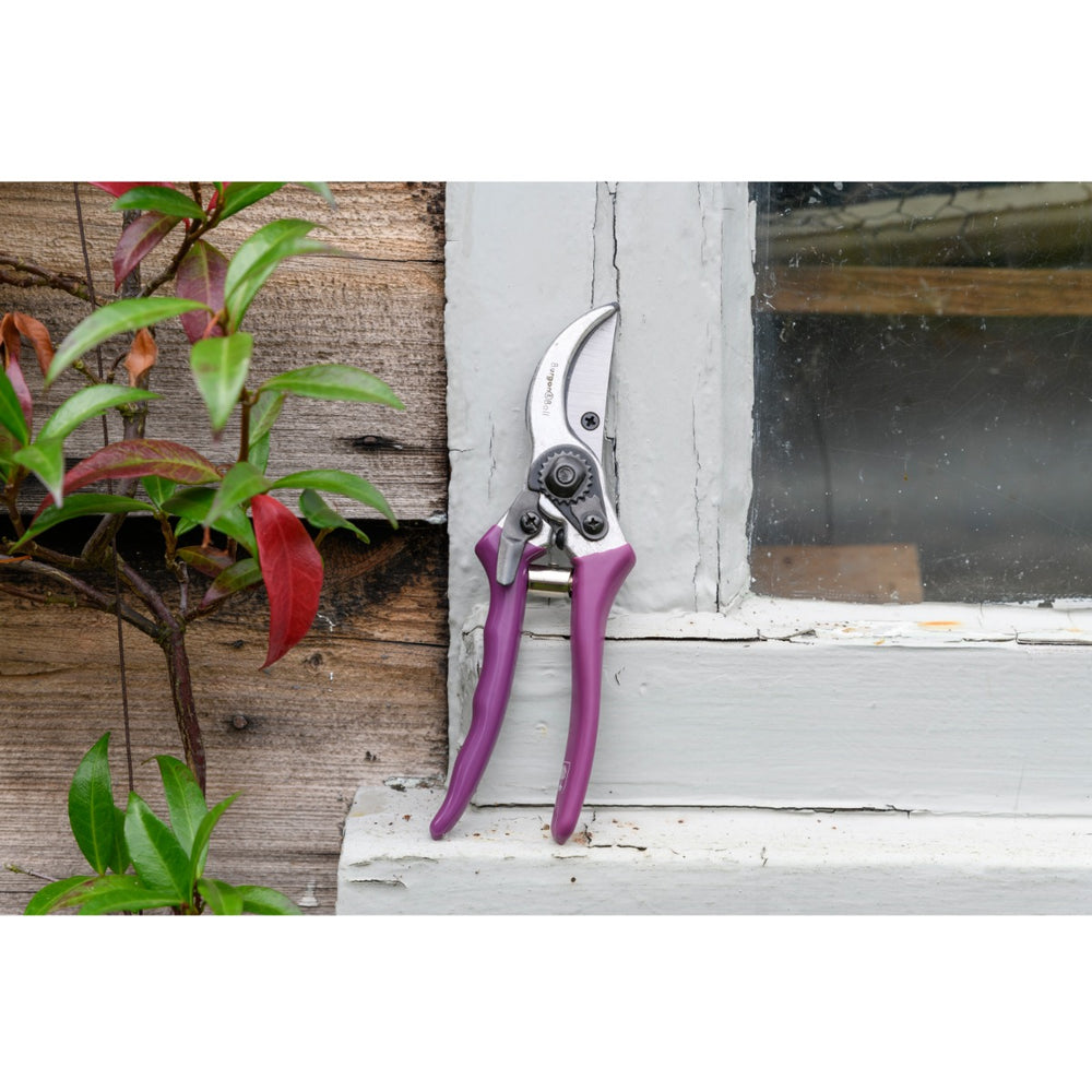 Secateur with purple contoured cushioned grip handles and a high carbon steel blade, featuring an easy release, secure blade lock. Presented in a recyclable giftbox featuring a floral design by Burgon & Ball.