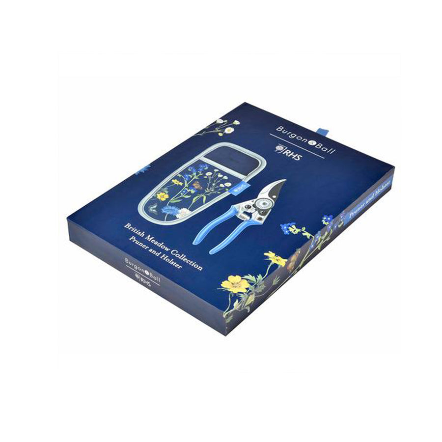 Burgon & Ball pruner and holster set, presented in a sage green gift tin featuring the RHS-endorsed floral 'Asteraceae' print.