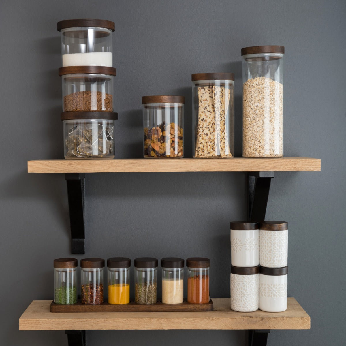Add some beautiful, simple style to your kitchen with this set of high quality spice storage jars, with a matching display board. With their glass bodies and dark-stain acacia wood lids, this set of 6 small jars are perfect for storing spices, herbs & cake sprinkles! The clear glass allows you to quickly identify your ingredients, and the wooden lid fits perfectly creating an airtight seal to preserve the contents.