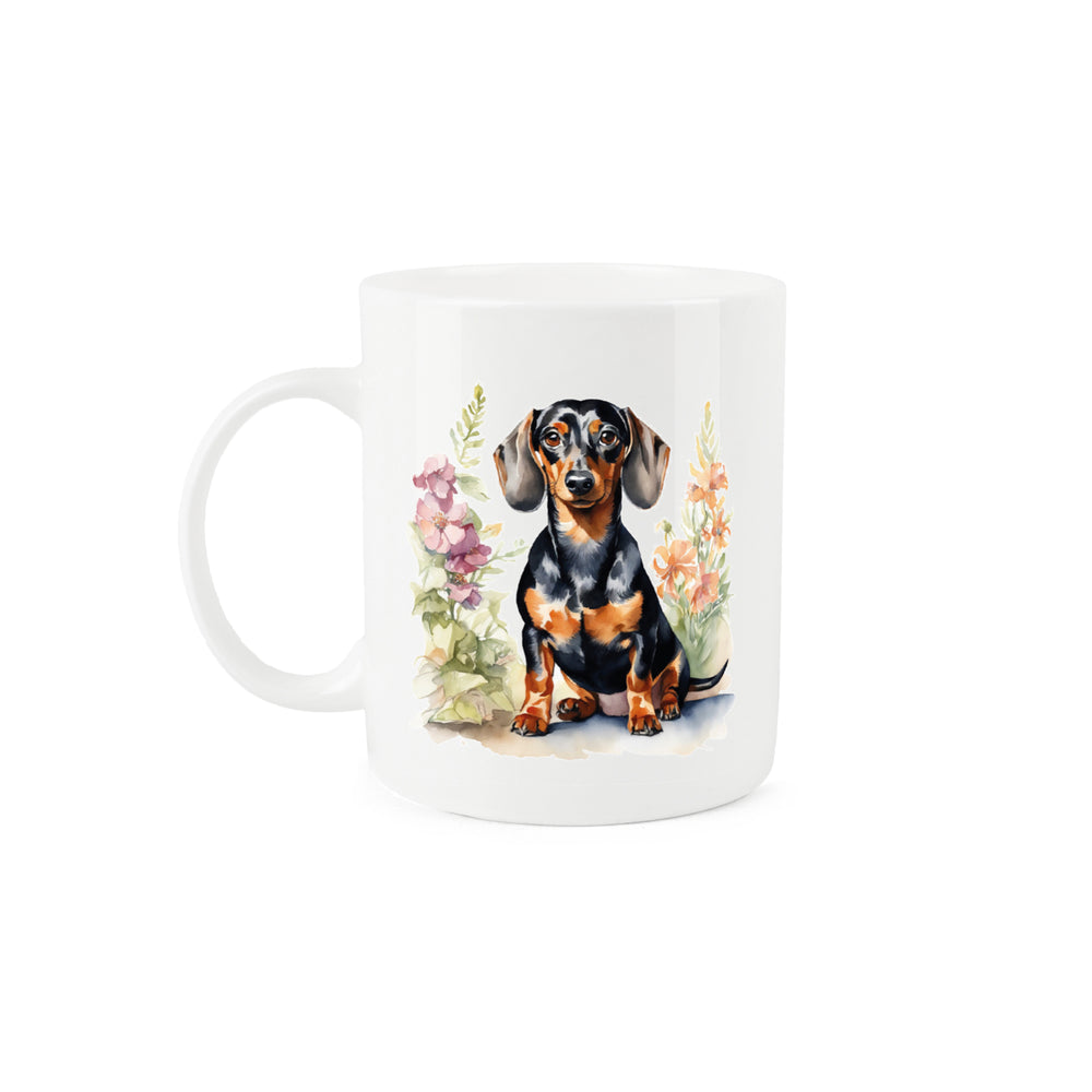 Featuring a picture of an adorable dachshund sat down amongst some flowers, treat the dachshund owner or lover in your life to this lovely mug!