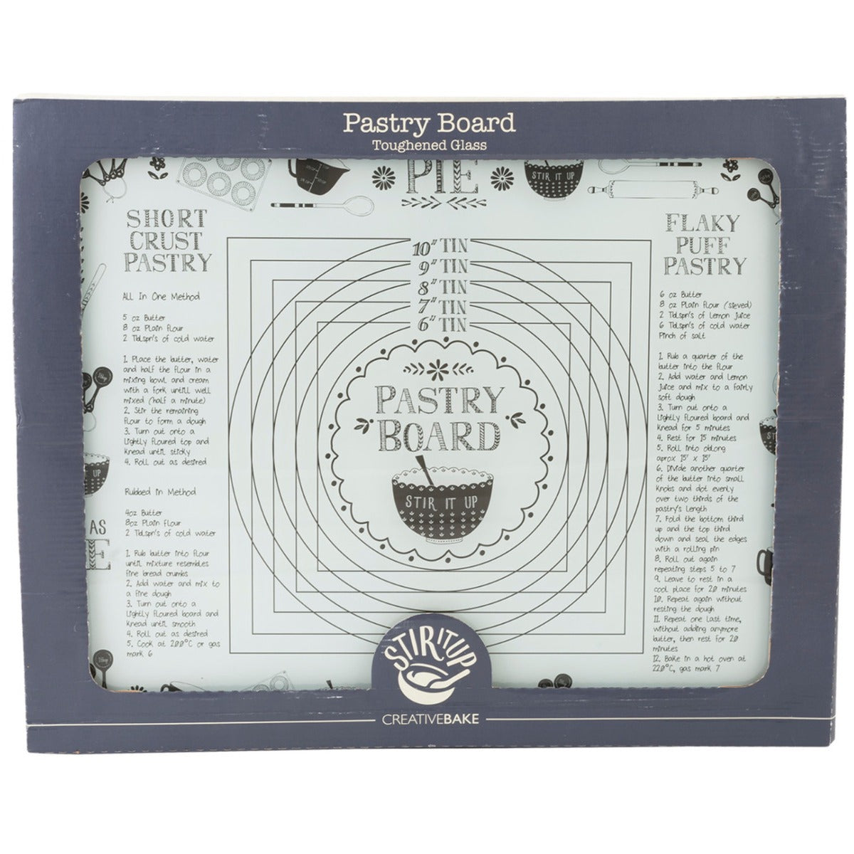 The perfect gift for anyone who loves cooking or baking! This large tempered glass worktop protector is practical while being very helpful to have to hand. Its design lists a shortcut pastry and a puff pastry recipe, giving you no excuse of forgetting how to make them! The surface protector also features measurement markings for rolling, and with a range of kitchen themed illustrations around the edge of the board, this piece of multi-functional kitchenware doubles ups as a decorative item to have on display in your kitchen at all times.