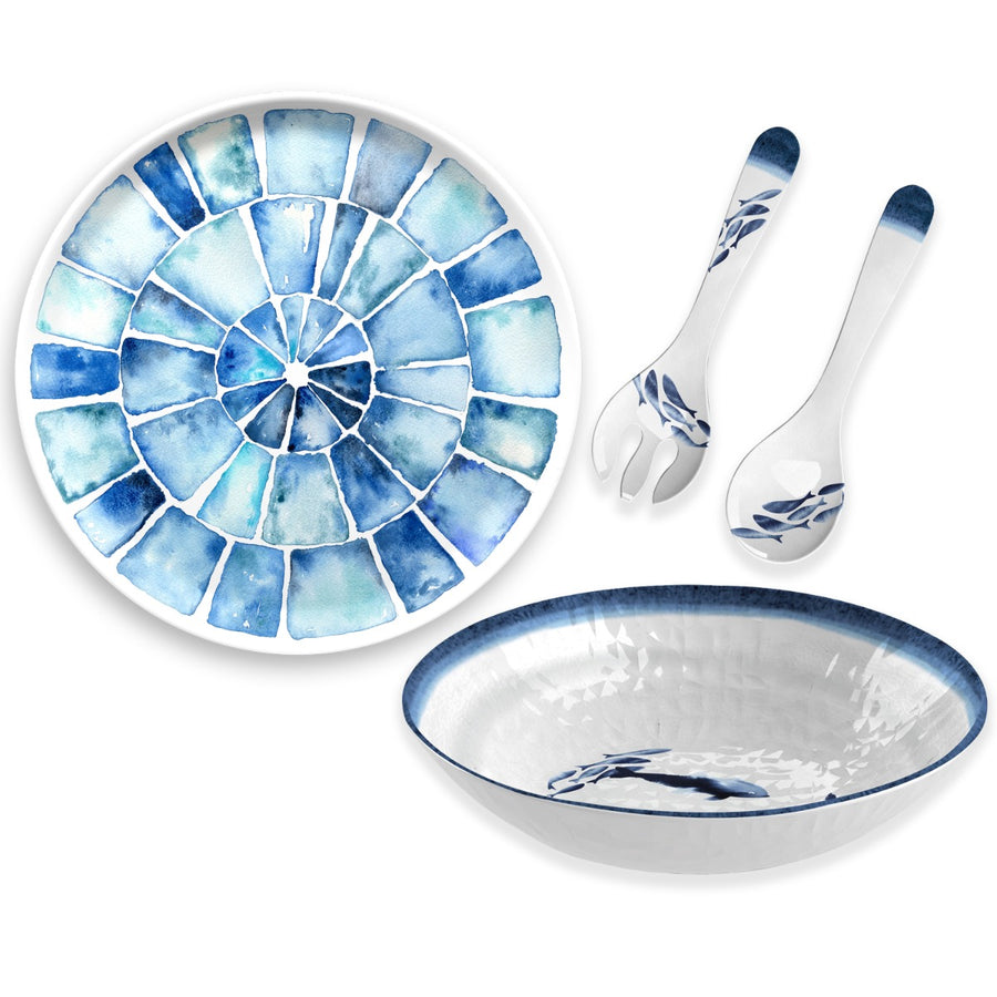 Get that seaside feeling wherever you are with this melamine coastal-inspired round platter, salad bowl and servers set. Perfect for using in your caravan, for camping or just in your garden when entertaining guests - these pieces will be the talk of the party! The stunning design of this set will remind you of holidays on the Cornish coast, and its blue and white pattern will really stand out on your table.
