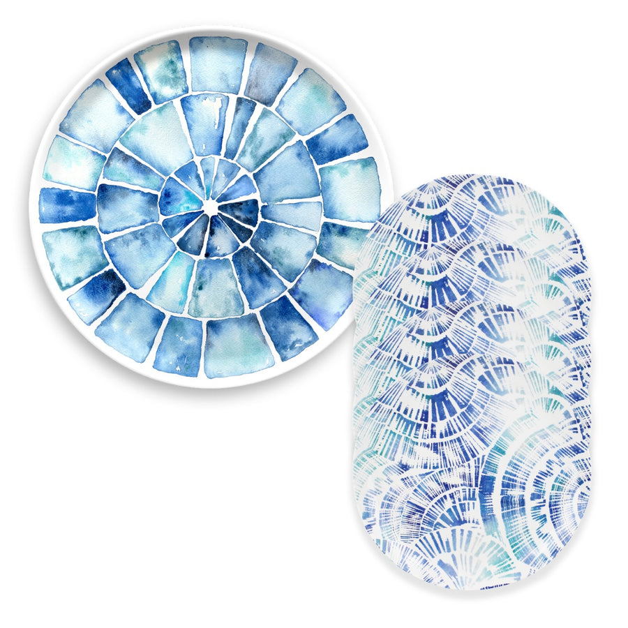 Get that seaside feeling wherever you are with this melamine coastal-inspired serving set. Perfect for using in your caravan, for camping or just in your garden when entertaining guests - these pieces will be the talk of the party! The stunning design of the round platter and side plates will remind you of holidays on the Cornish coast, and their blue and white pattern will really stand out on your table.
