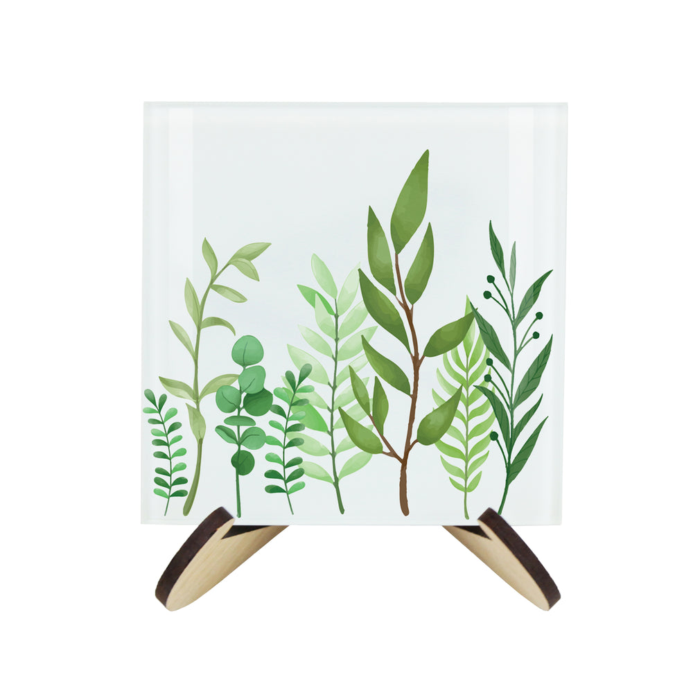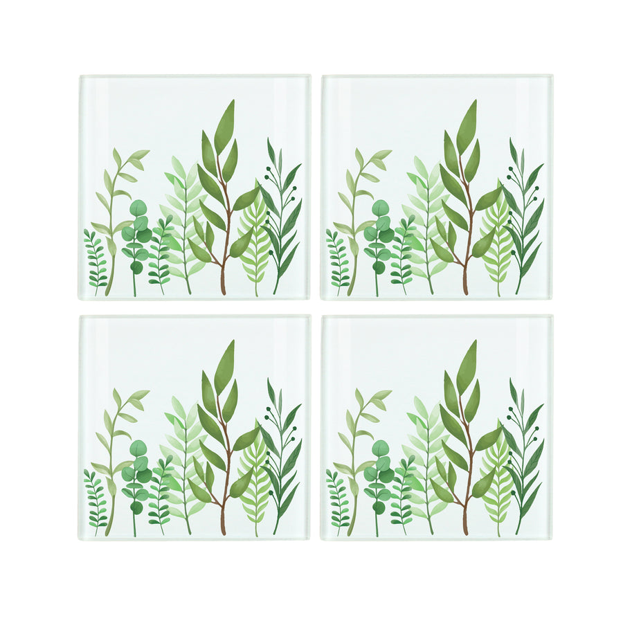 This set of lovely drinks coasters feature a vibrant foliage design, perfect for adding a touch of nature to your home! Displaying ferns and leaves in various shades of green, each coaster in this pretty set is made from glass with non-slip feet. Available to purchase with a wood-effect stand.