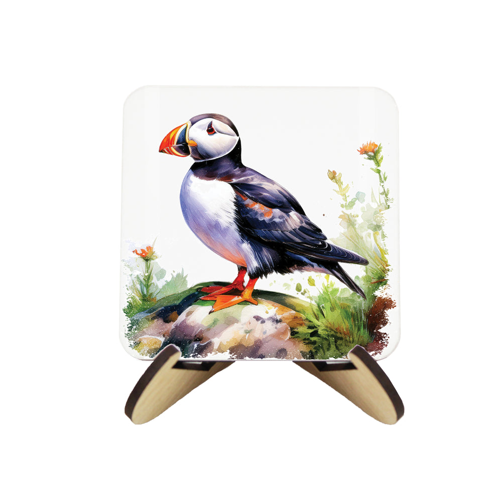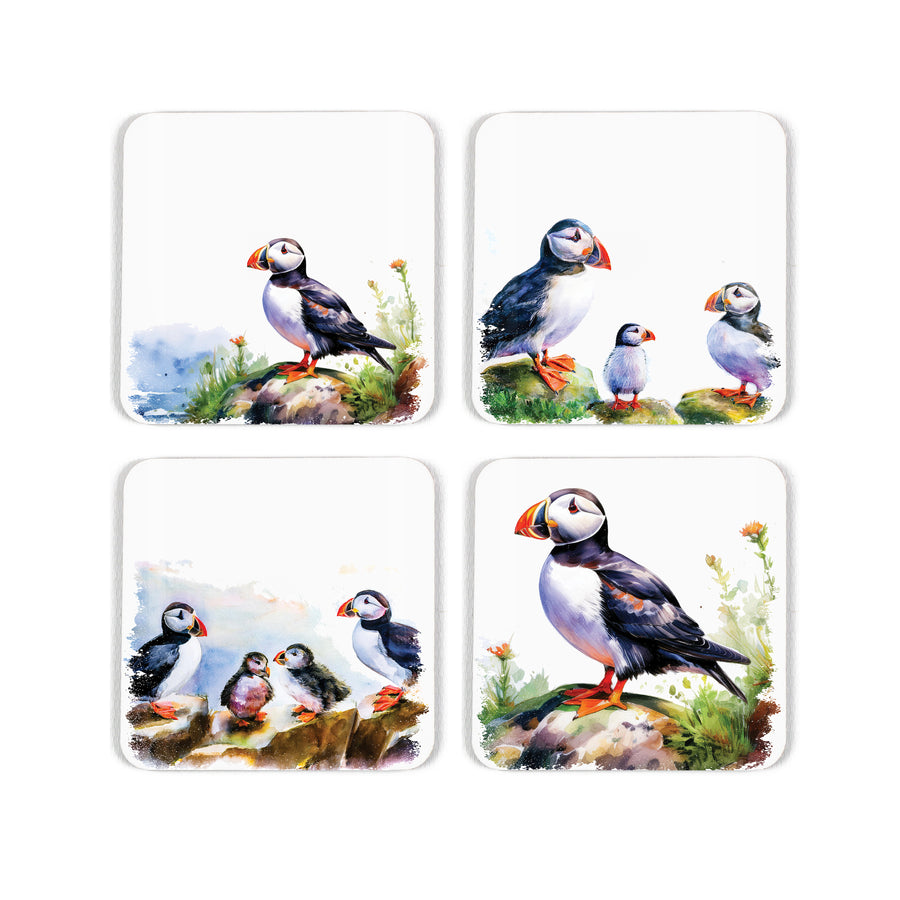 Whether you're a puffin fan, or simply a lover of the seaside, this set of gorgeous square coasters are perfect for you! Featuring an aesthetic coastal design, with puffins perched upon boulders, these cork-backed coasters would make an ideal housewarming gift, or a lovely (and practical) addition to your own home! Available to purchase with a wood-effect stand.