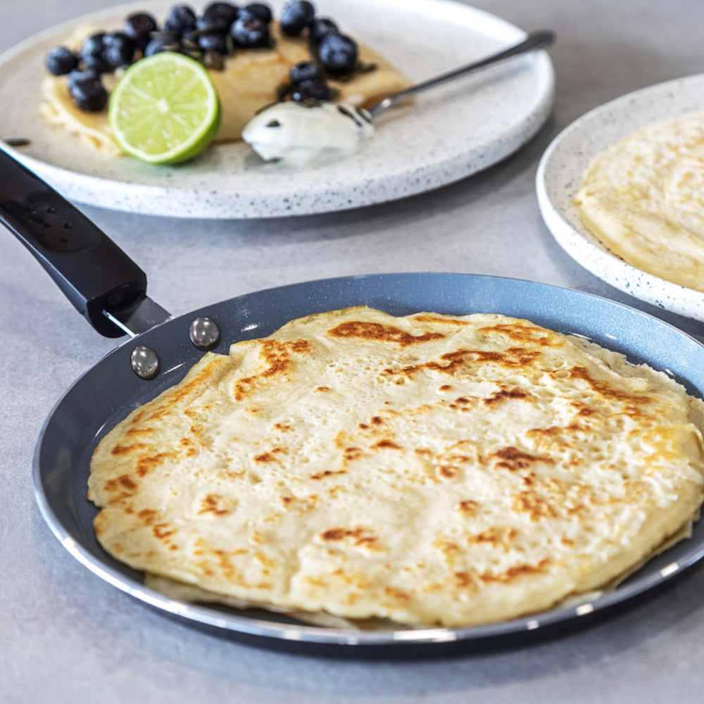 Sweet or savoury - what's your pick? Whether you're whipping up a ham & cheese delight, or a buttermilk creation full of fresh fruits, this pan is the ideal kitchen companion. Crafted from high quality materials, this pan features a chemical-free ceramic coating - which is both healthier for yourself, and better for the environment! The aluminium inner allows for even heat distribution, whilst the stainless iron base allows the pan to be used on a variety of heat sources - including induction.