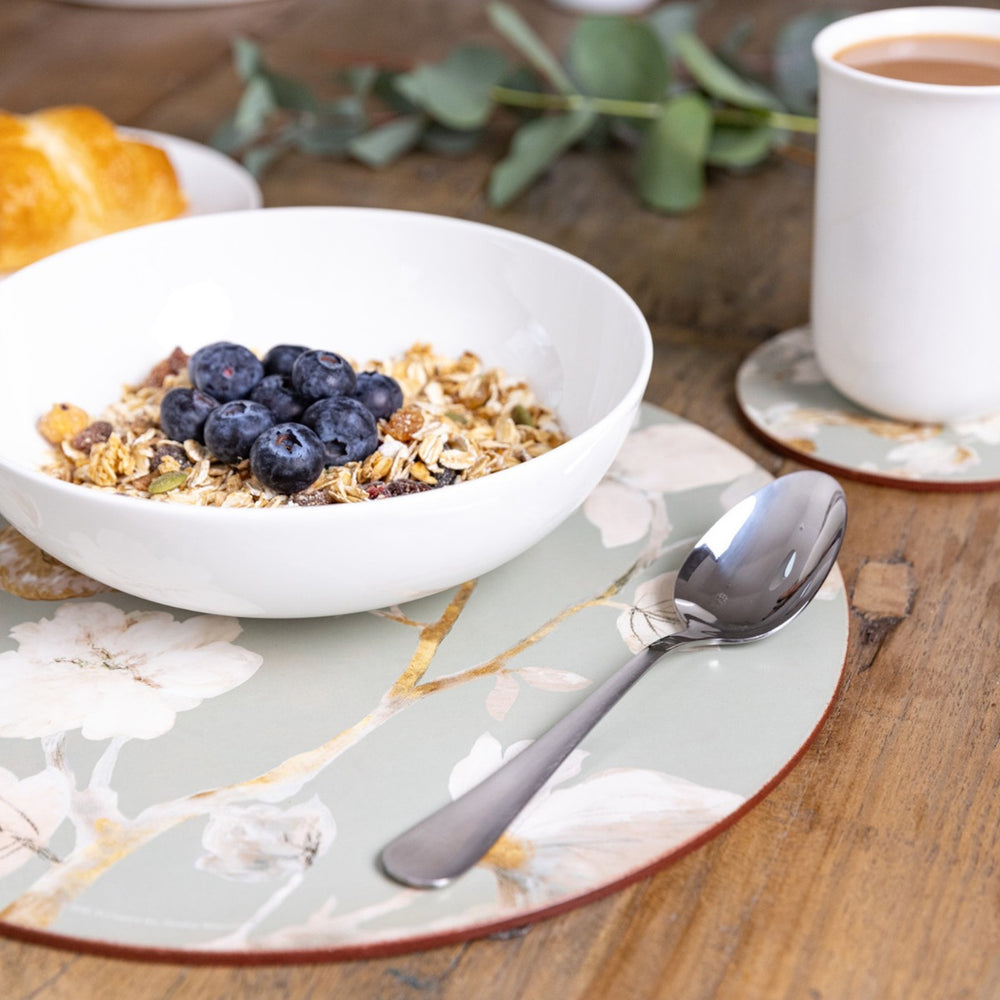 Protect your table with style using these cork-backed wooden placemats! Featuring an elegant bird resting on a branch surrounded by flowers against a duck egg blue background, this set of four placemats are finished with a luxury lacquer coating to make them smooth to touch and easy to clean. Each of the placemats are slip resistant, stain resistant and heat resistant up to 120°C.